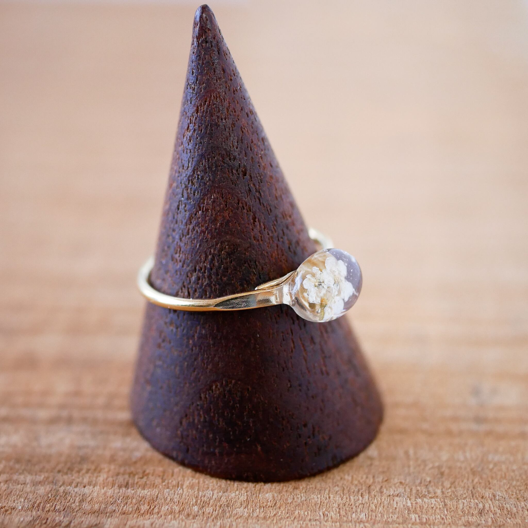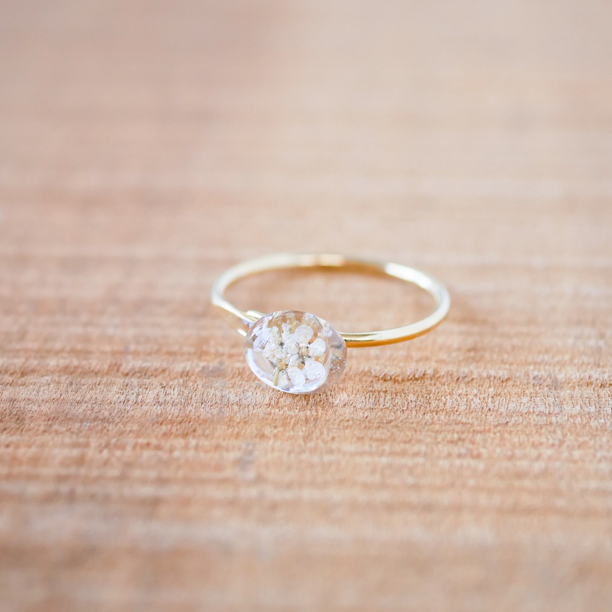 押し花にしたレースフラワーのお花を閉じ込めた、押し花リング。