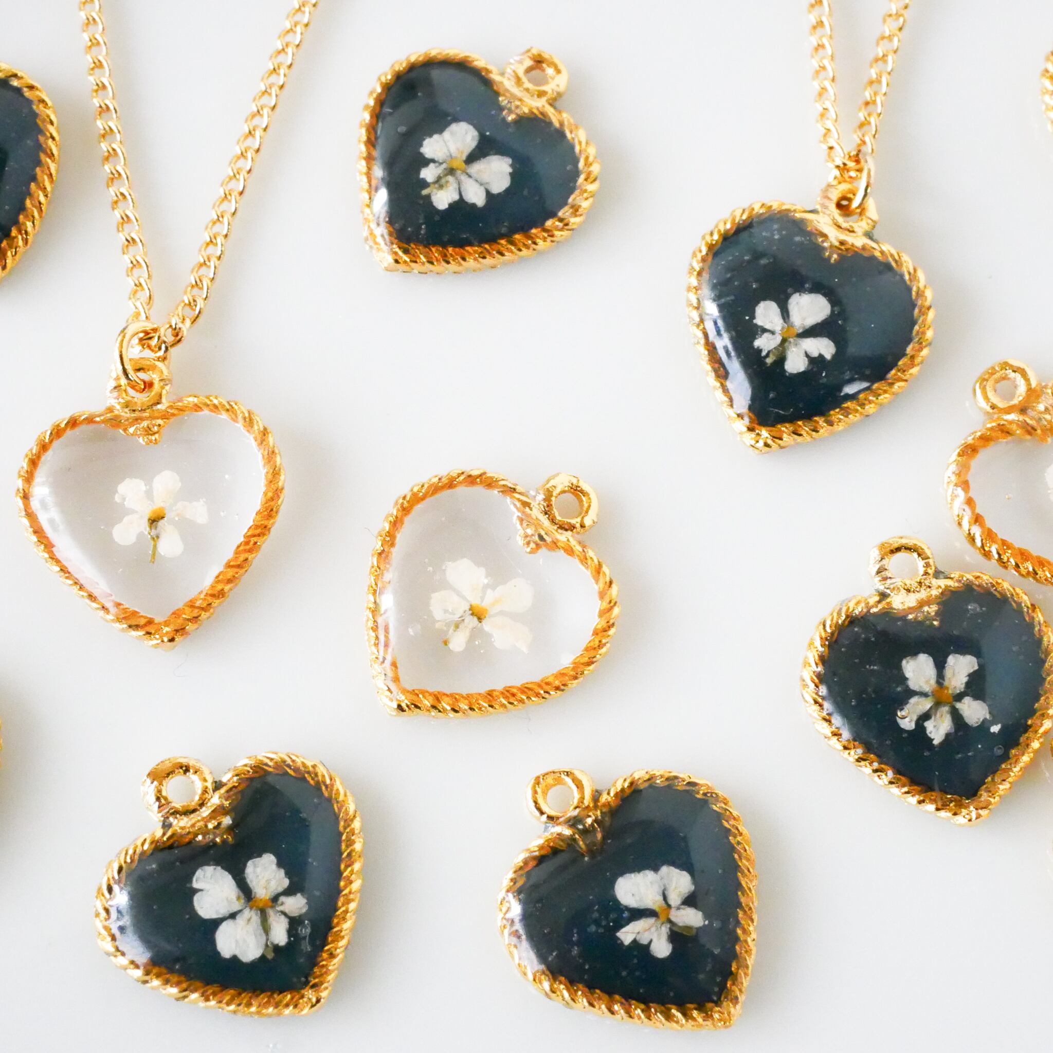 小さなハートのカボションに、繊細なレースフラワーの押し花をあしらった、愛らしくもエレガントなデザインのネックレスです。