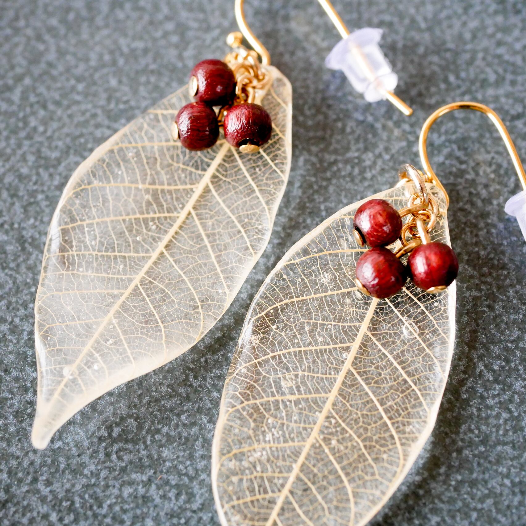 葉脈だけ残した葉っぱを、樹脂でコーティングした本物のリーフピアス。