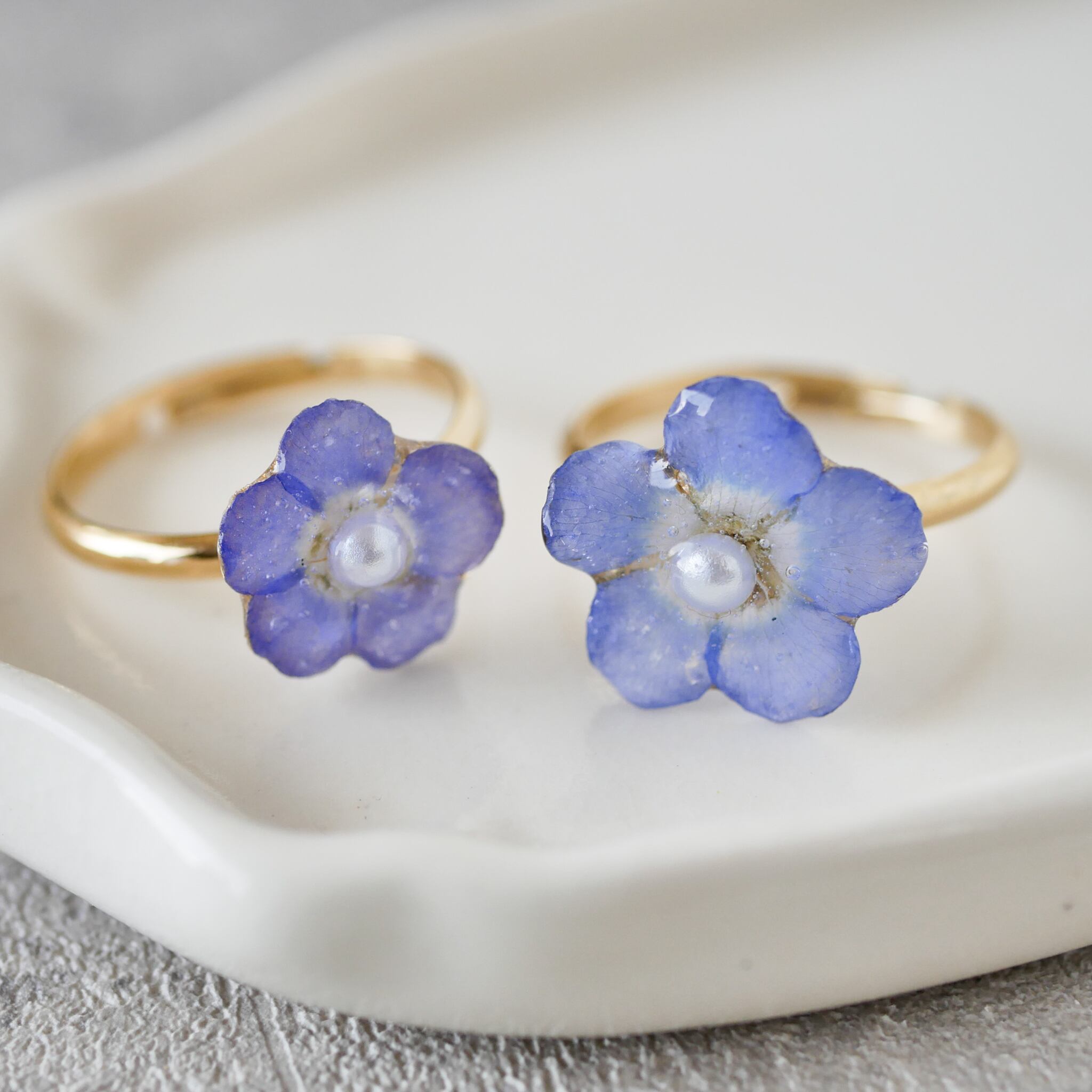 本物のネモフィラを丁寧にドライフラワーにし、透明感のある樹脂で閉じ込めたリングです。