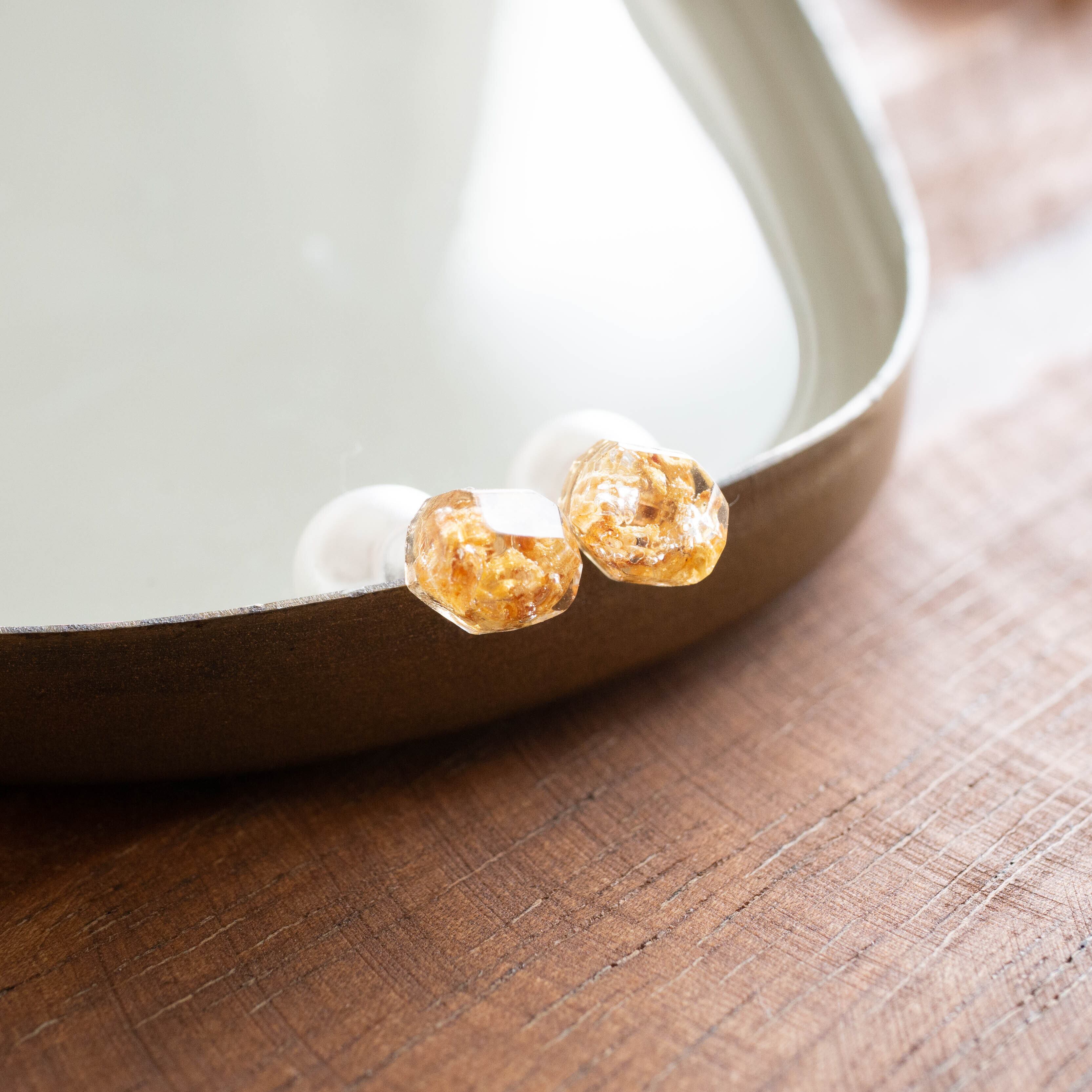 金木犀の花びらをドライフラワーにして、小さな鉱石の型に樹脂で閉じ込めた小粒ピアスです。