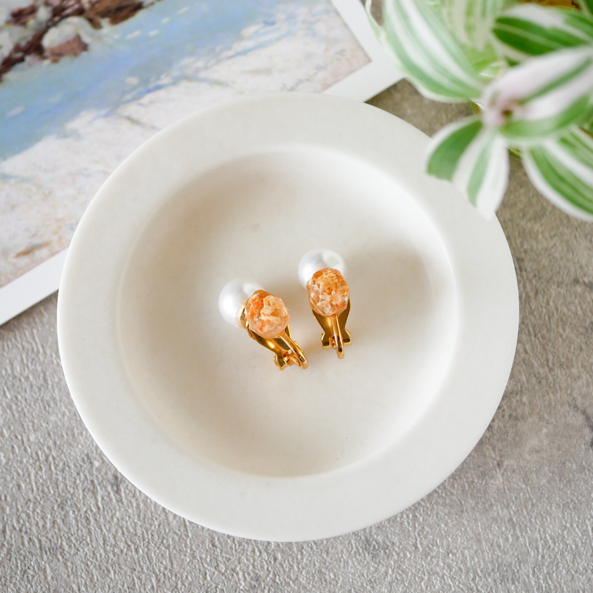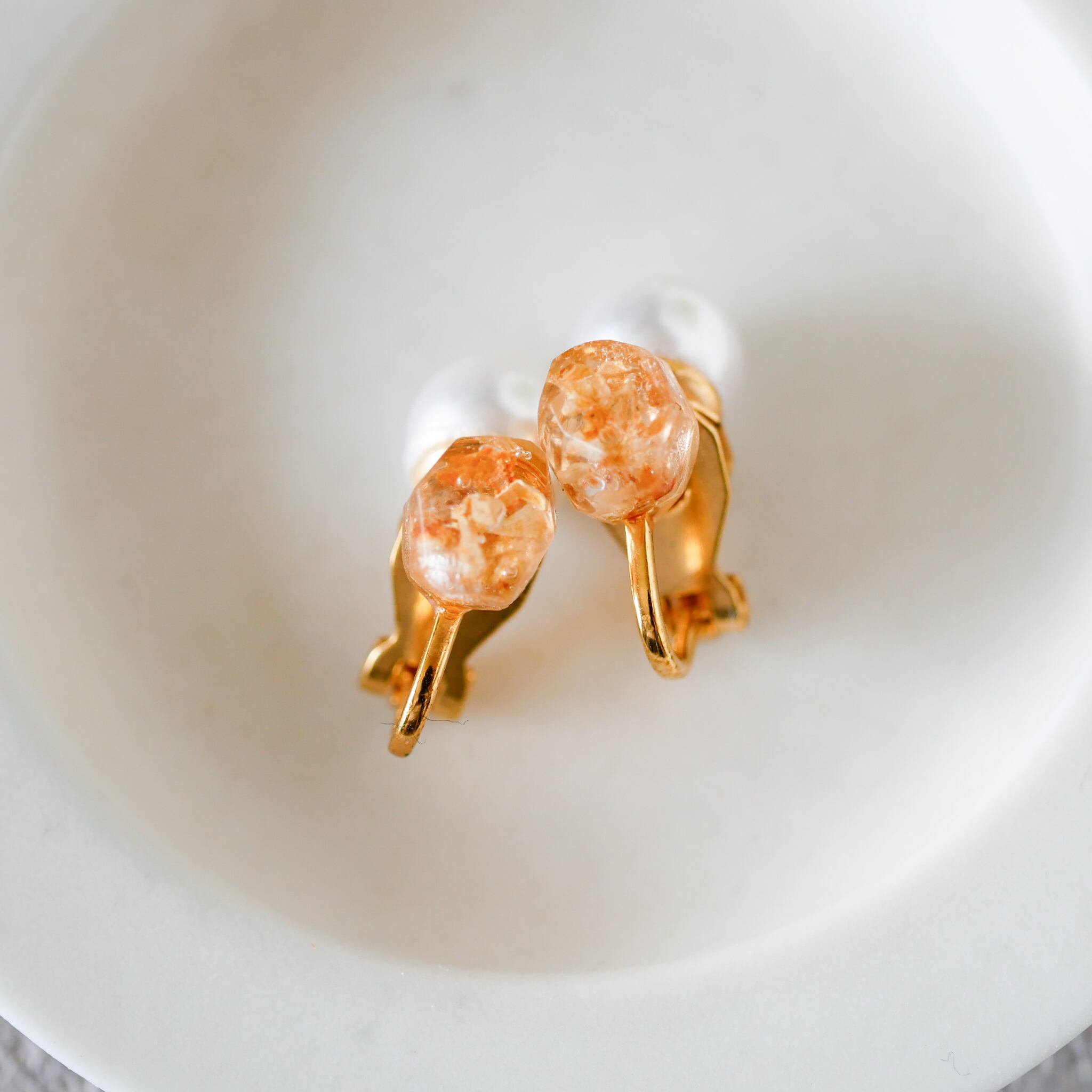 金木犀の花びらをドライフラワーにして、小さな鉱石の型に樹脂で閉じ込めた小粒イヤリングです。