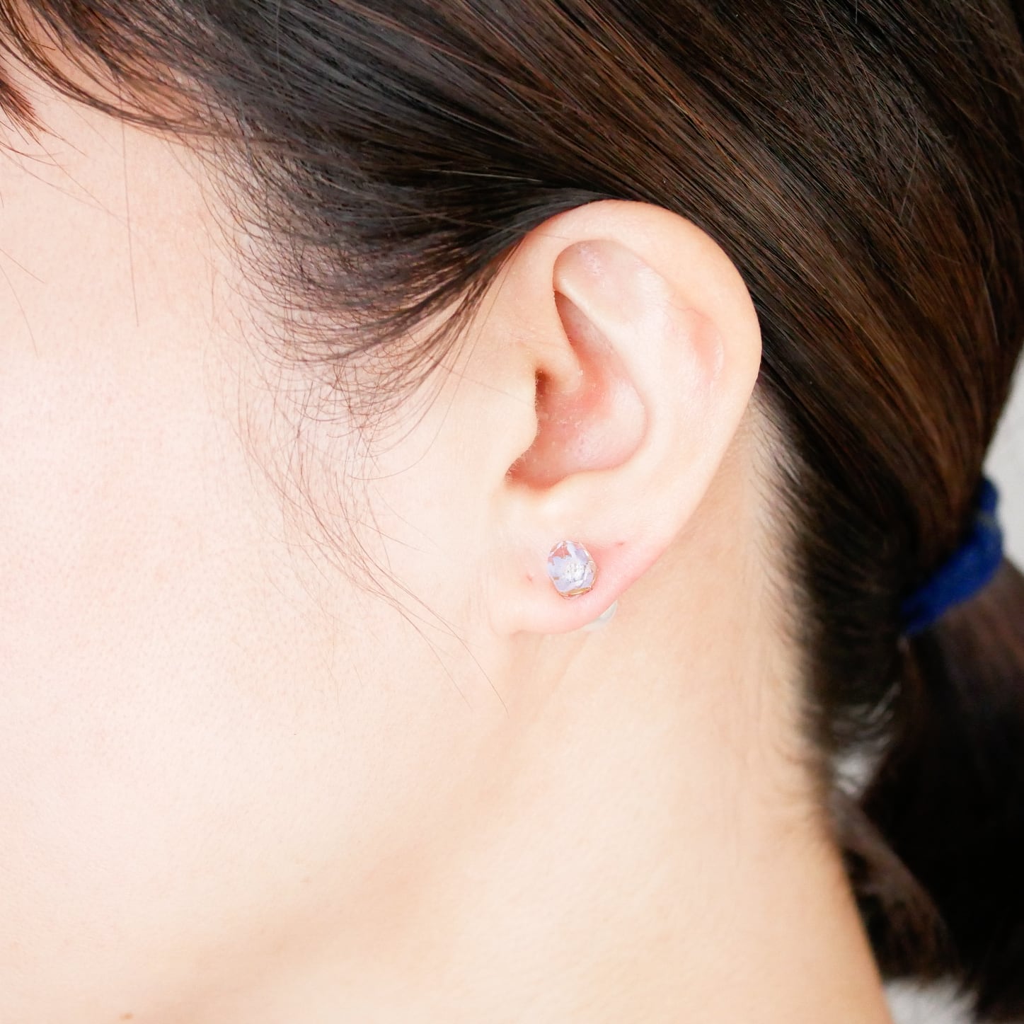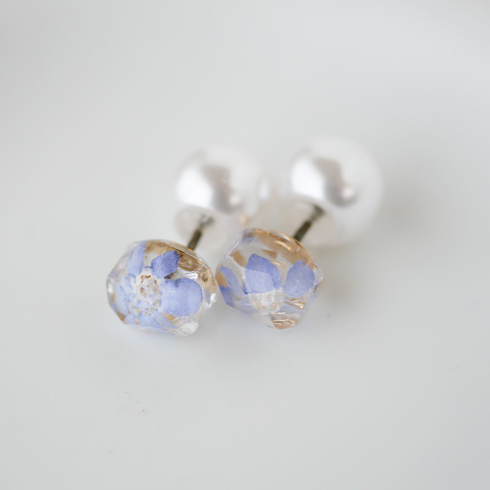 自家製の忘れな草をドライフラワーにして、小さな鉱石の形に樹脂で閉じ込めた小粒ピアスです。