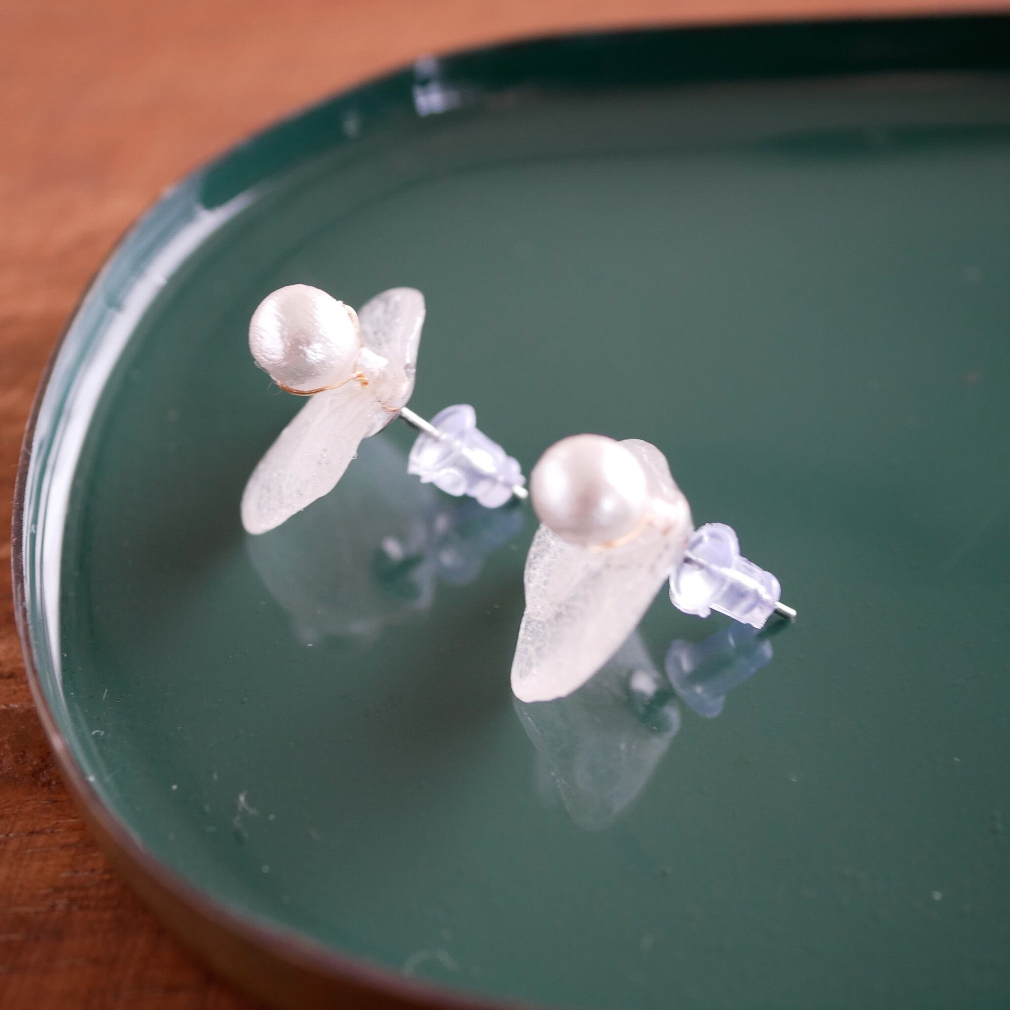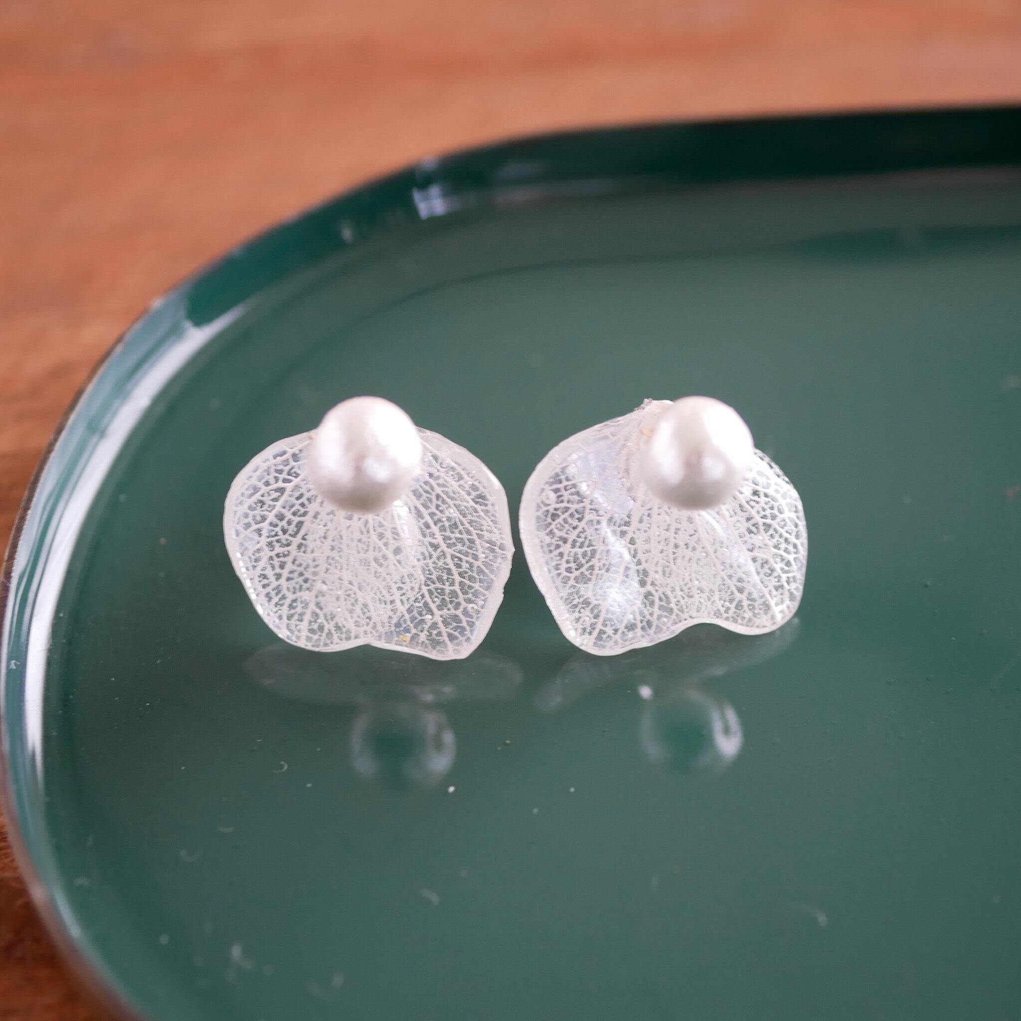 樹脂のツヤ感と透明感がガラスのようで、葉脈も透けて見えて清潔感あるピアスは、結婚式などのお出かけスタイルにもおすすめ。