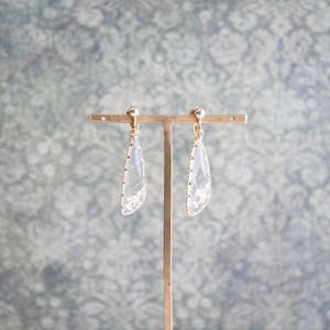 縦長のしずく型フォルムは、顔まわりをすっきり見せてくれるデザイン。中に閉じ込めた小さな白い花が、シンプルながらもさりげない個性を加えています。