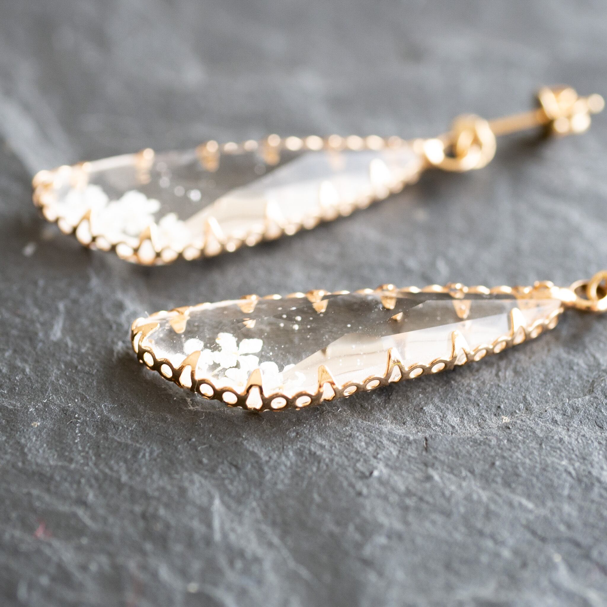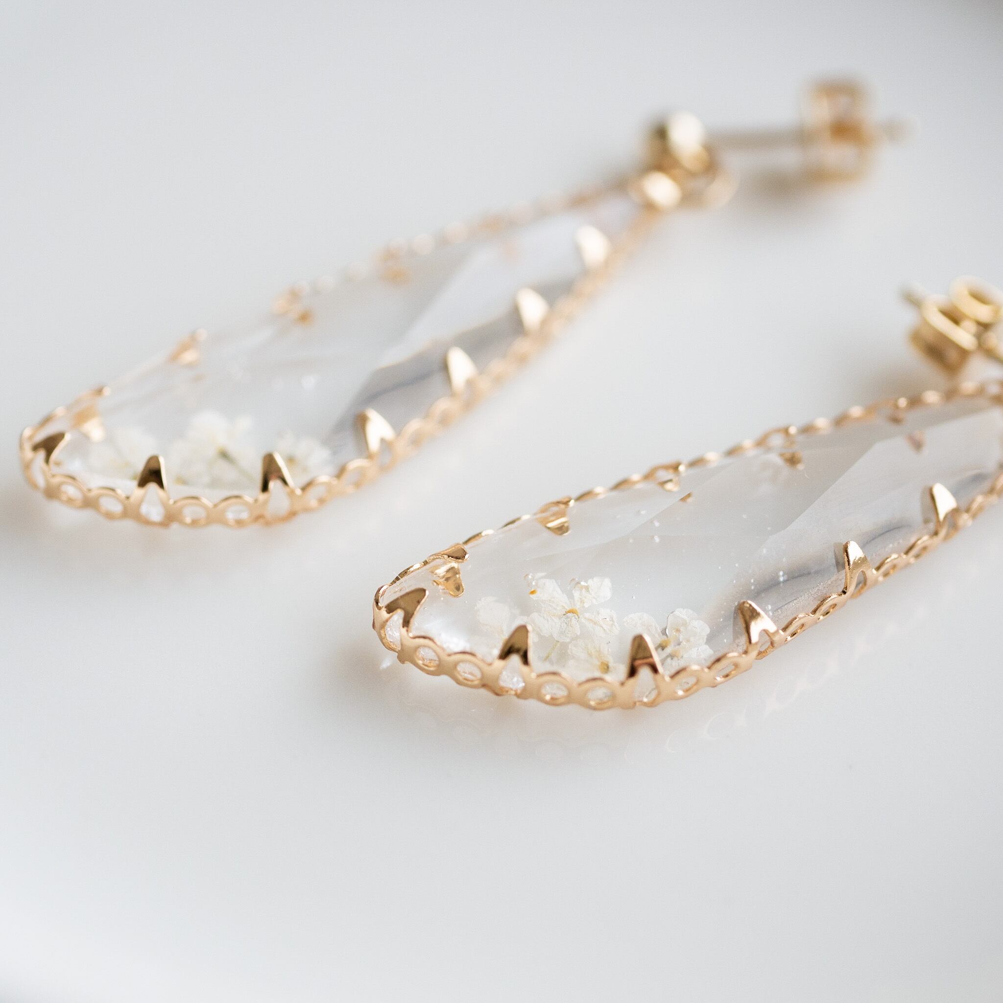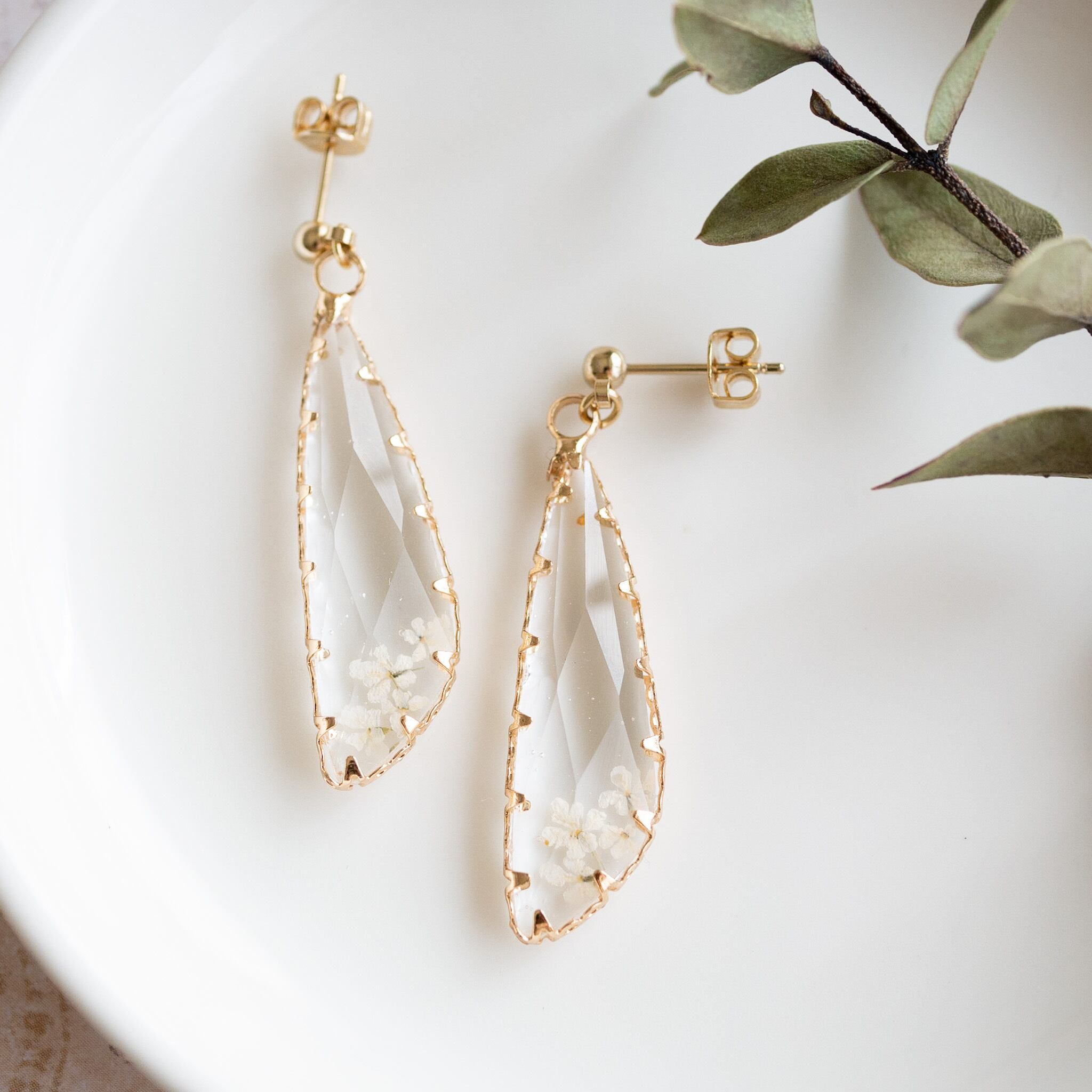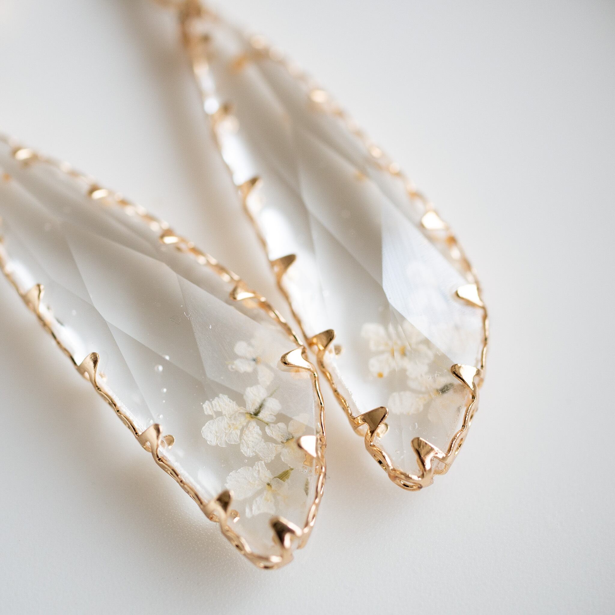 ドロップ型のクリスタルパーツにレースフラワーの押し花を組み合わせたロングピアス。
