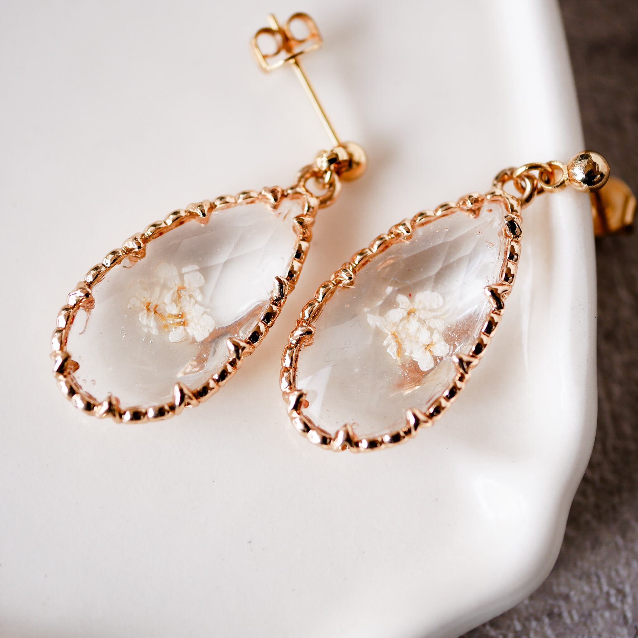 雫型のクリスタルに、小さなレースフラワーのお花を組み合わせたドロップピアス。