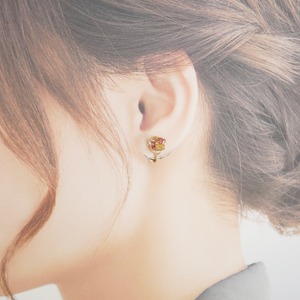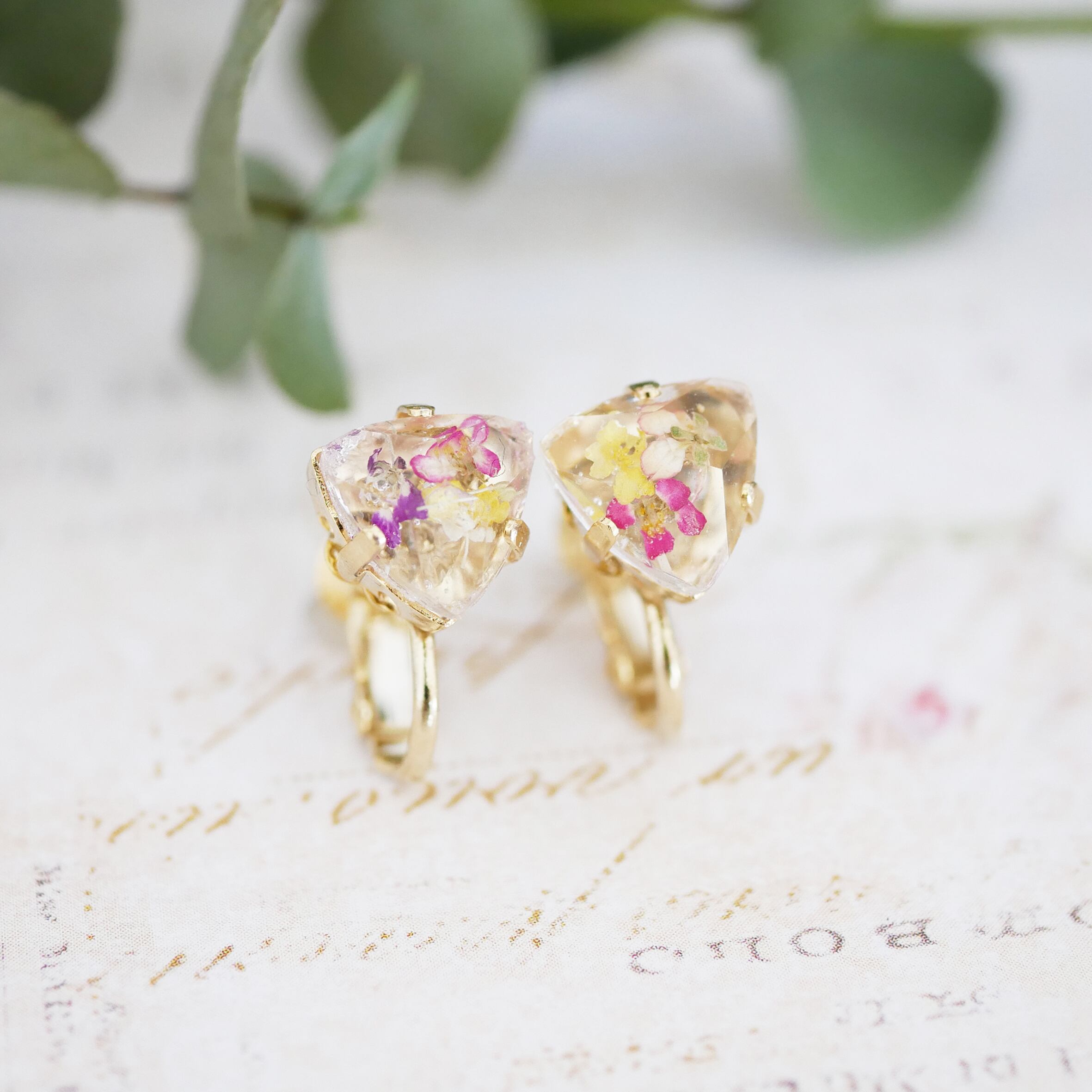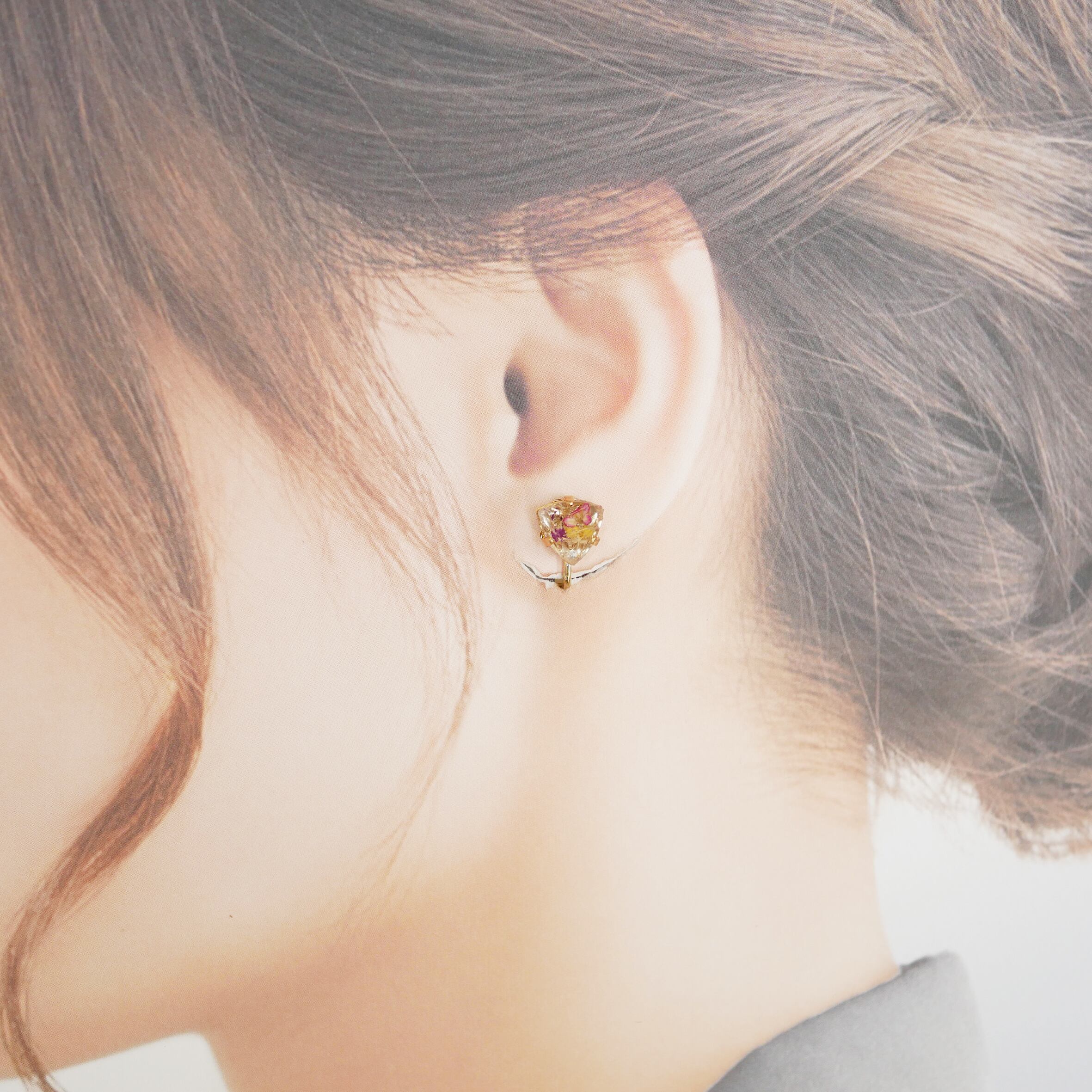 スワロフスキークリスタルの形の中にドライフラワーをとじ込めたオリジナルアクセサリー。