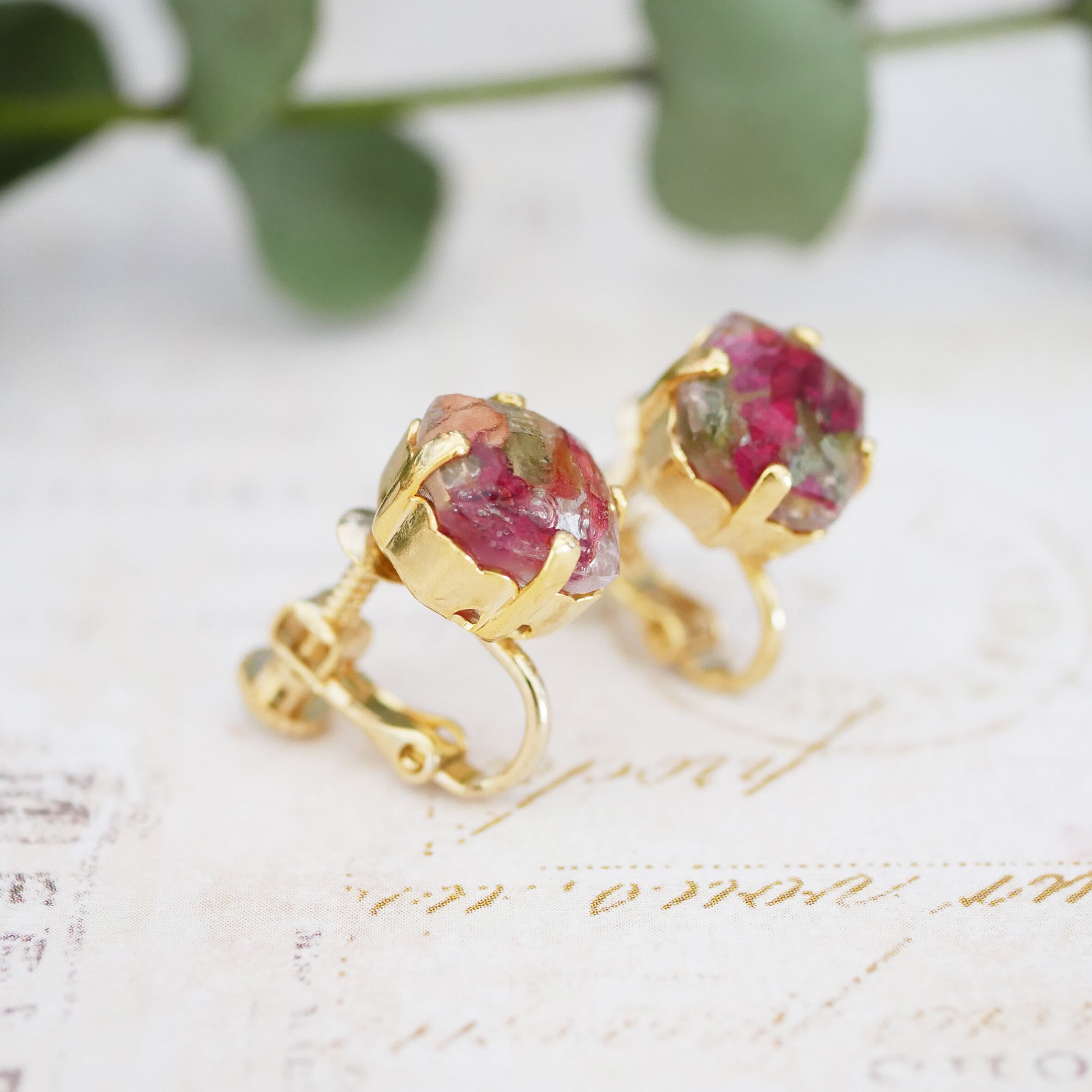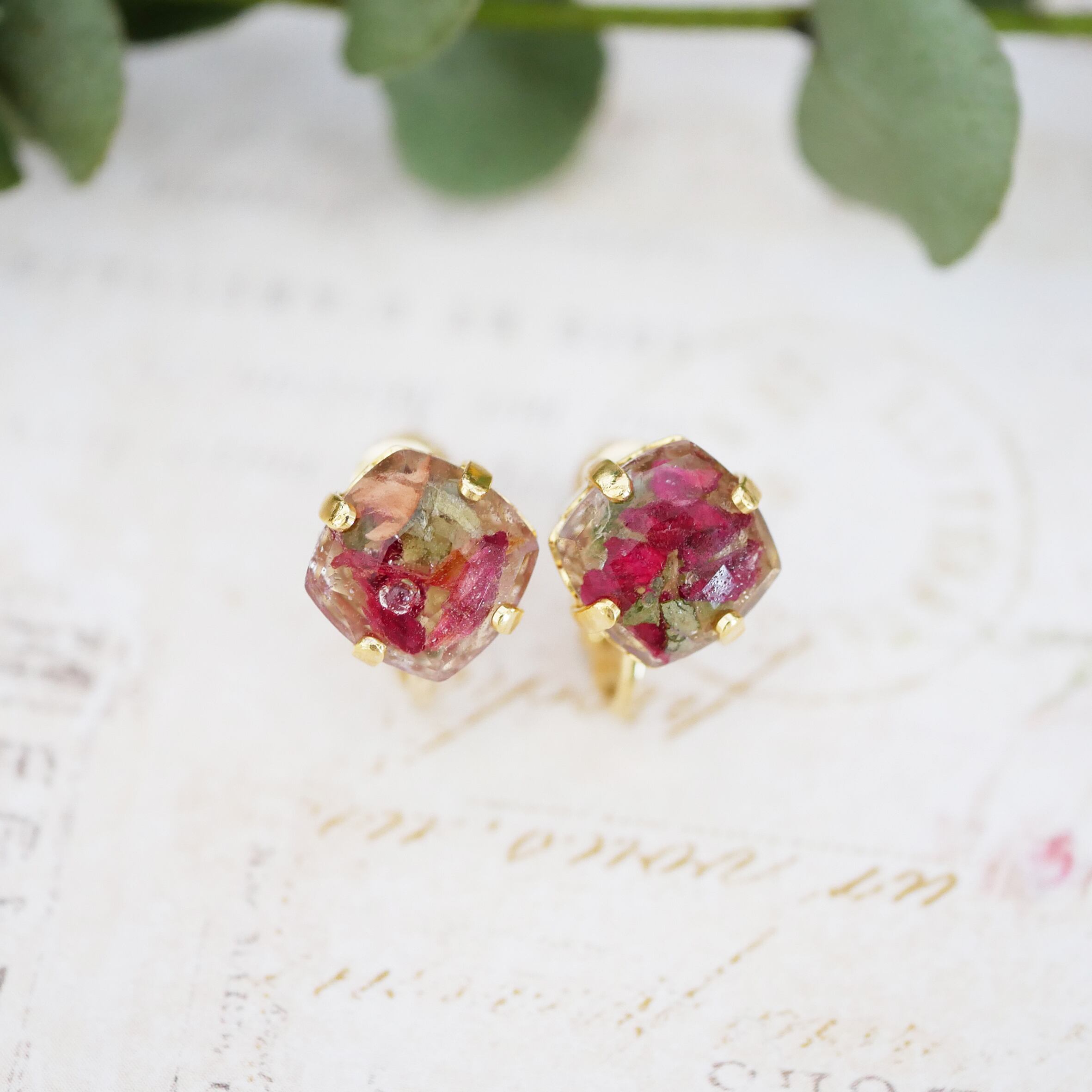 丸みのある正方形のスワロ型に、バラの花びらをたくさん詰め込んだイヤリング。