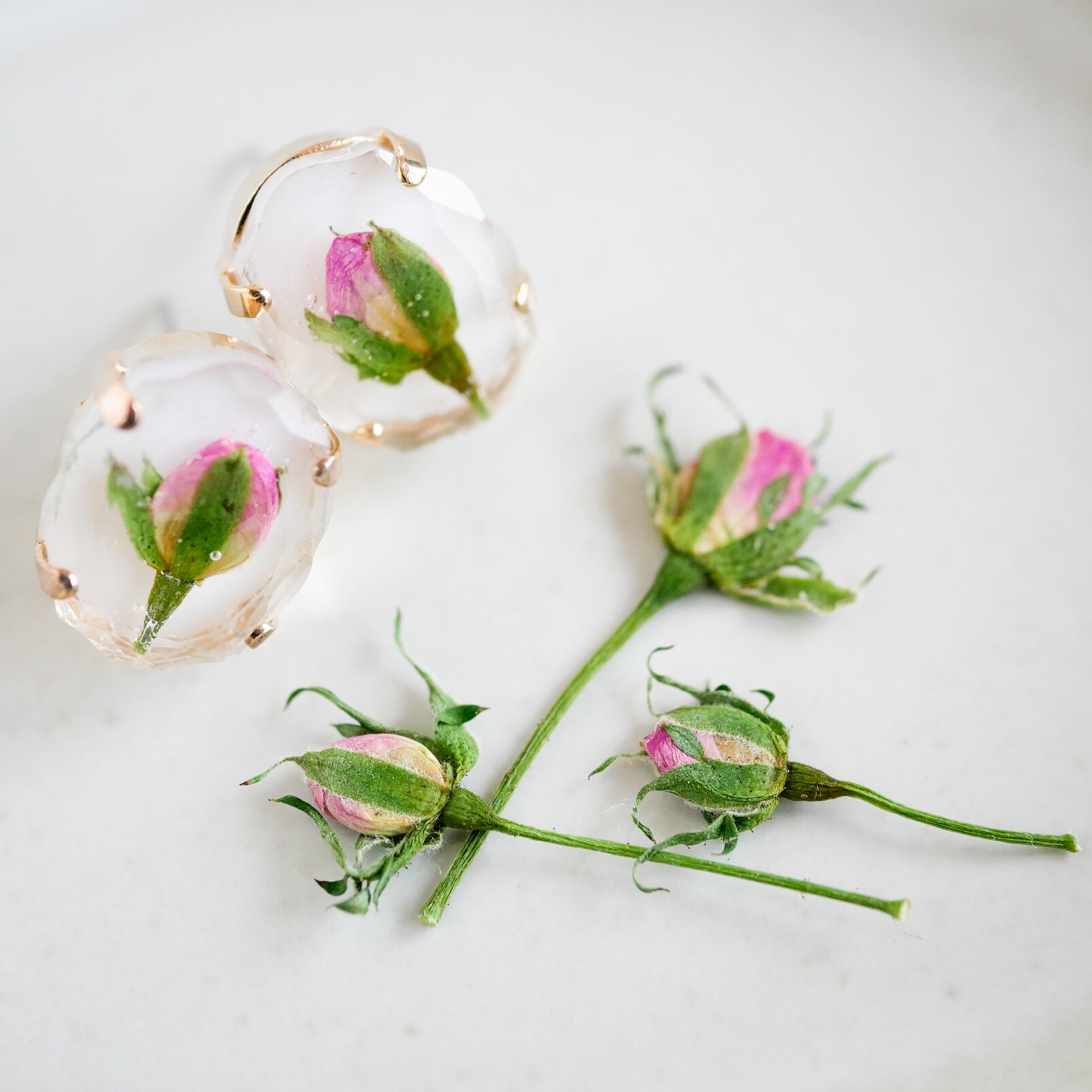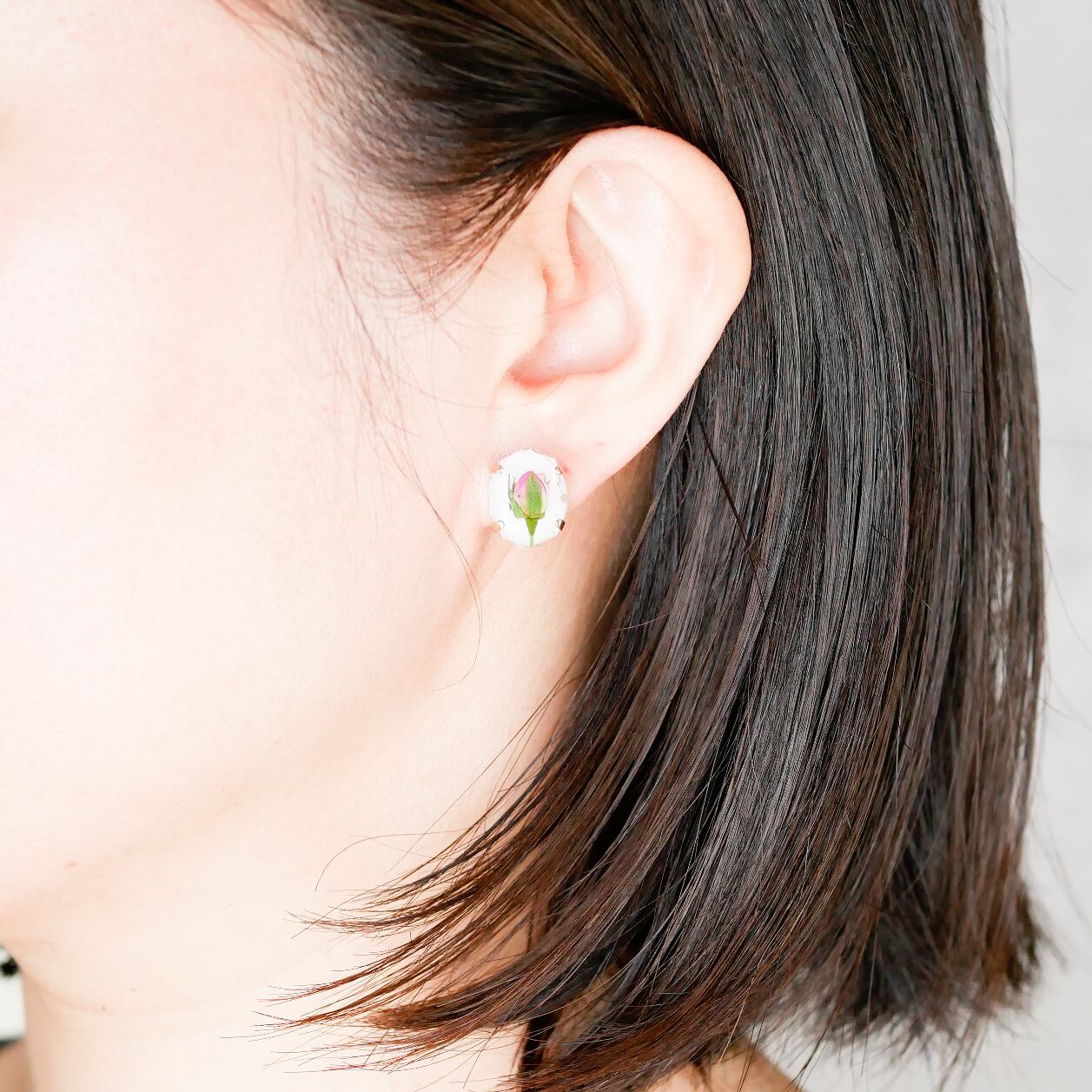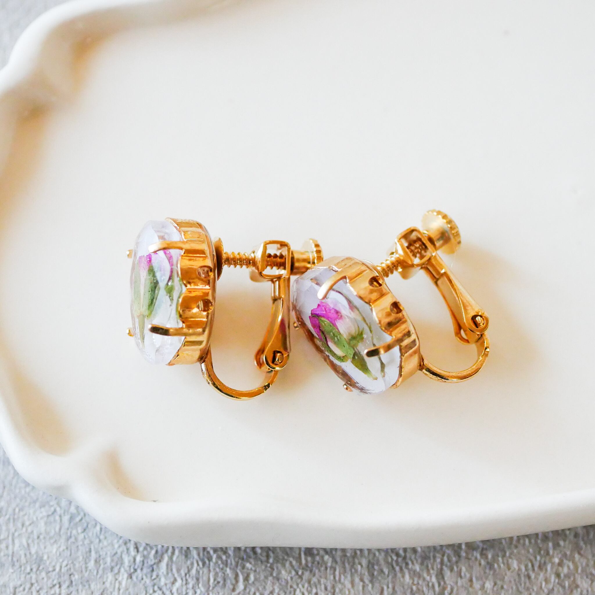 小さなカメオのようなオーバル型のパーツに、ミニバラの押し花をとじ込めました。