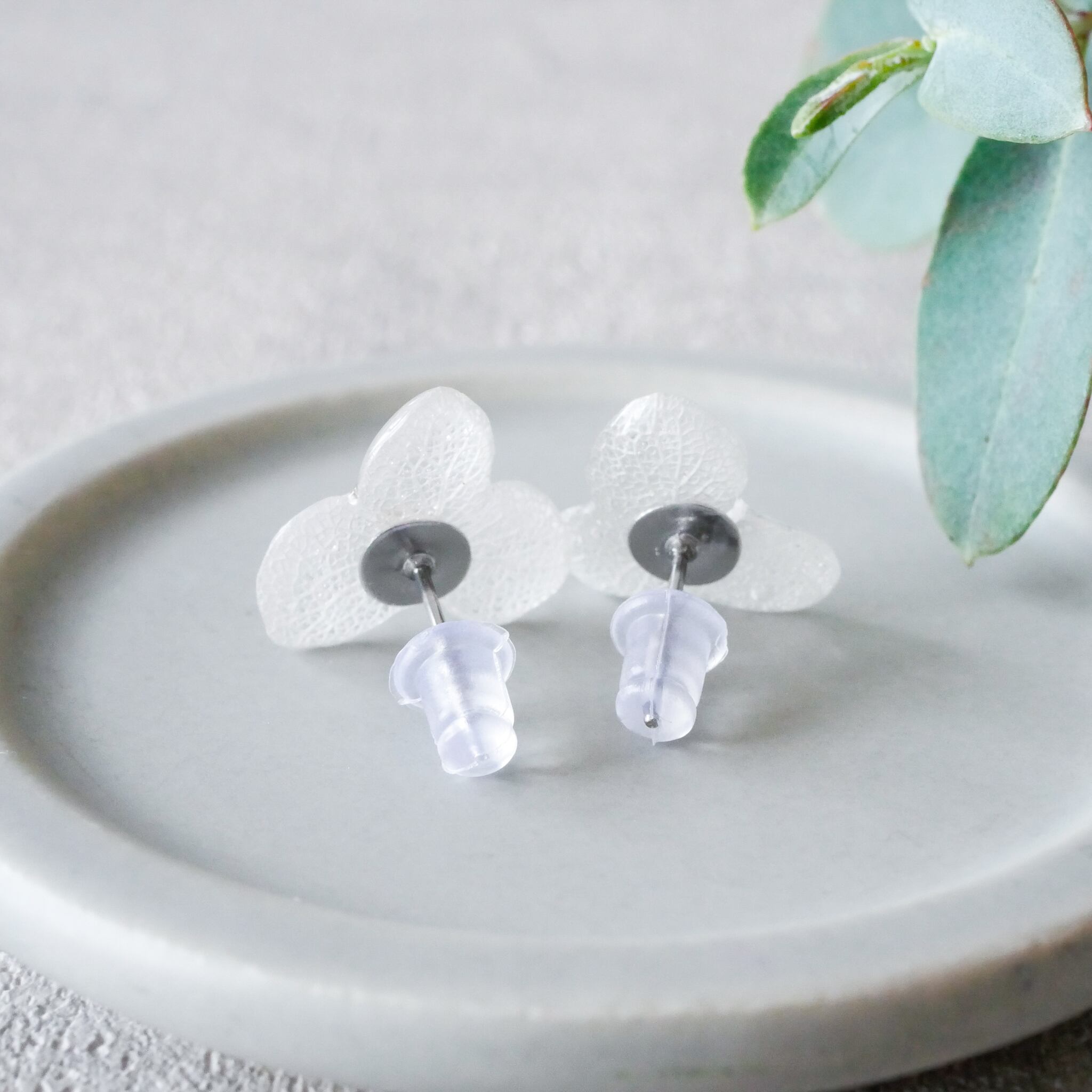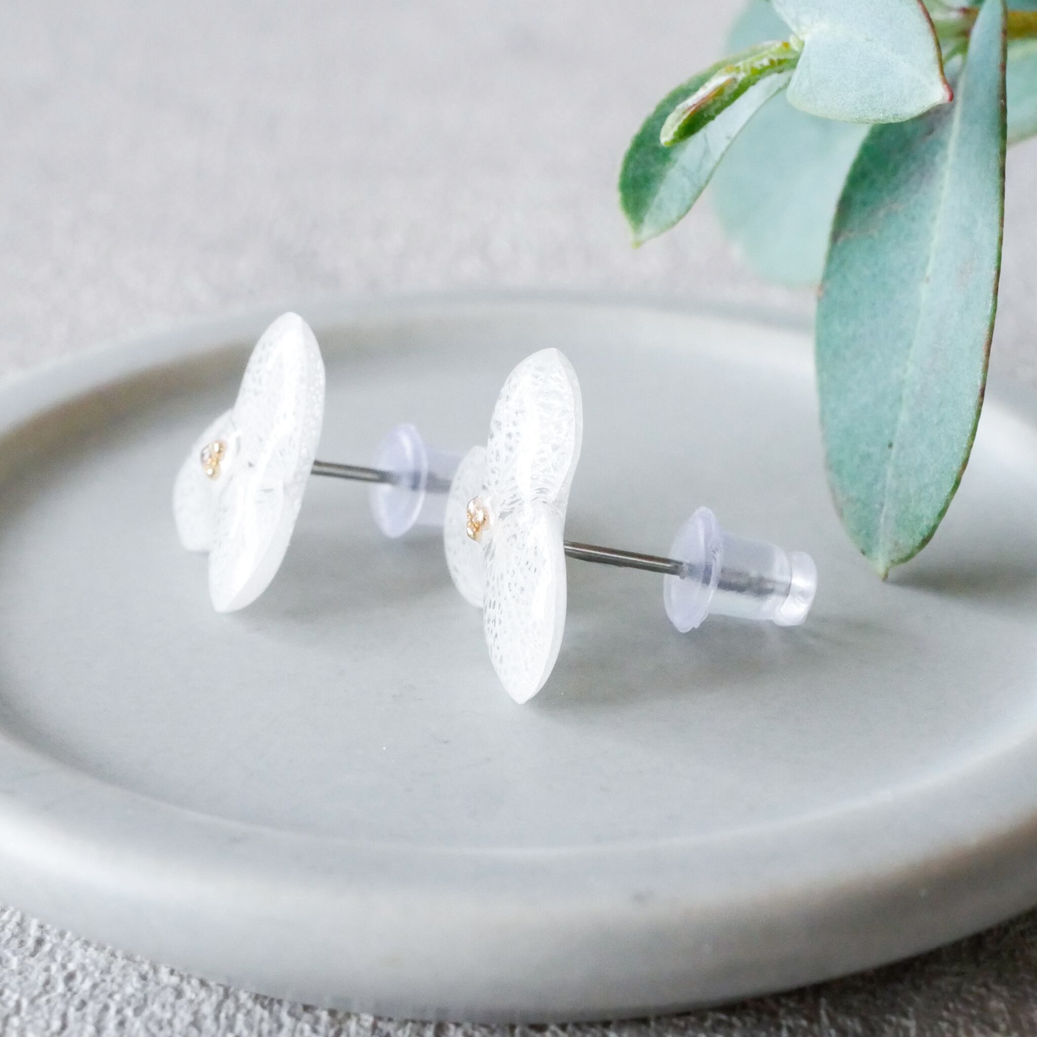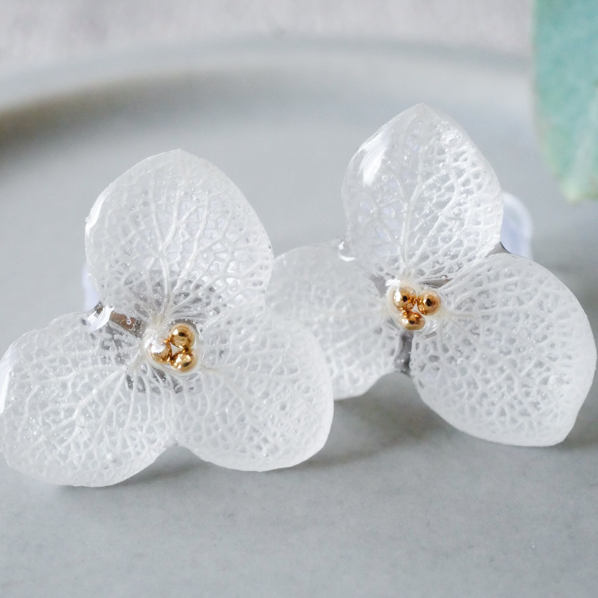 ホワイトカラーの紫陽花を樹脂でコーティングしたシンプルなピアス。