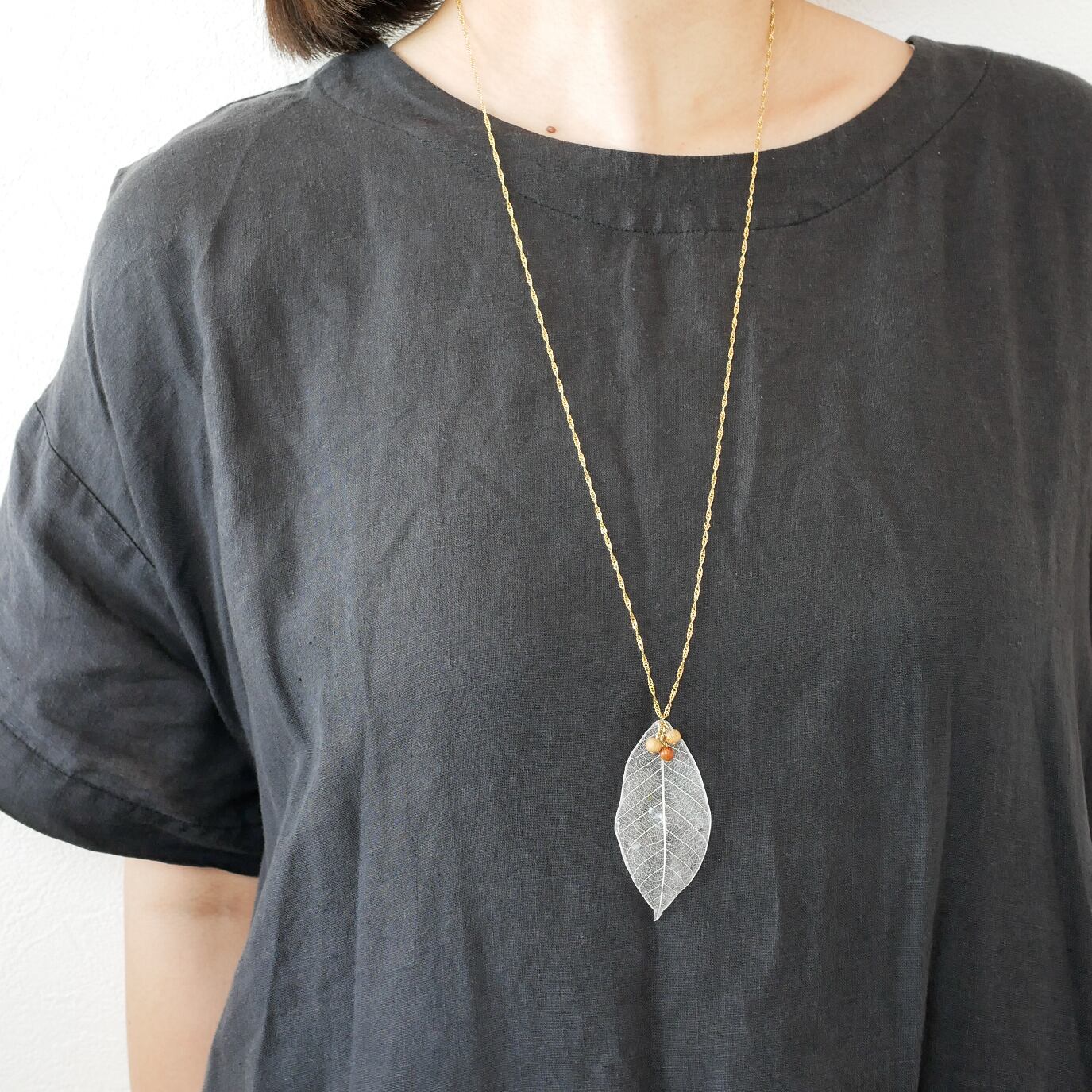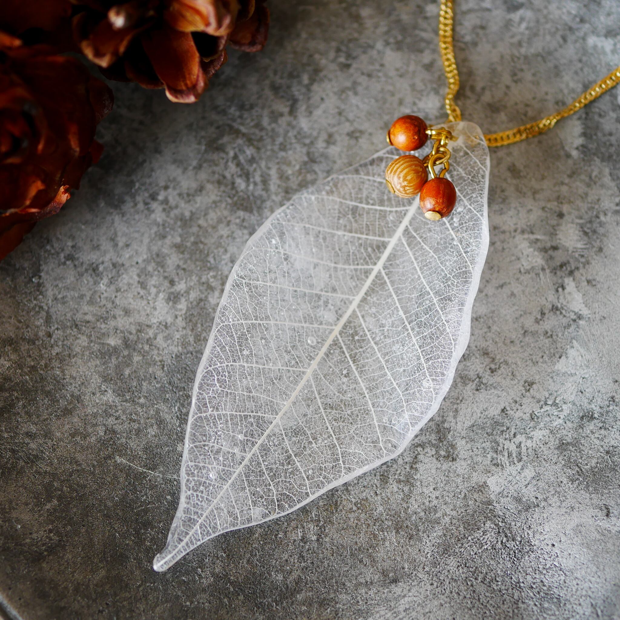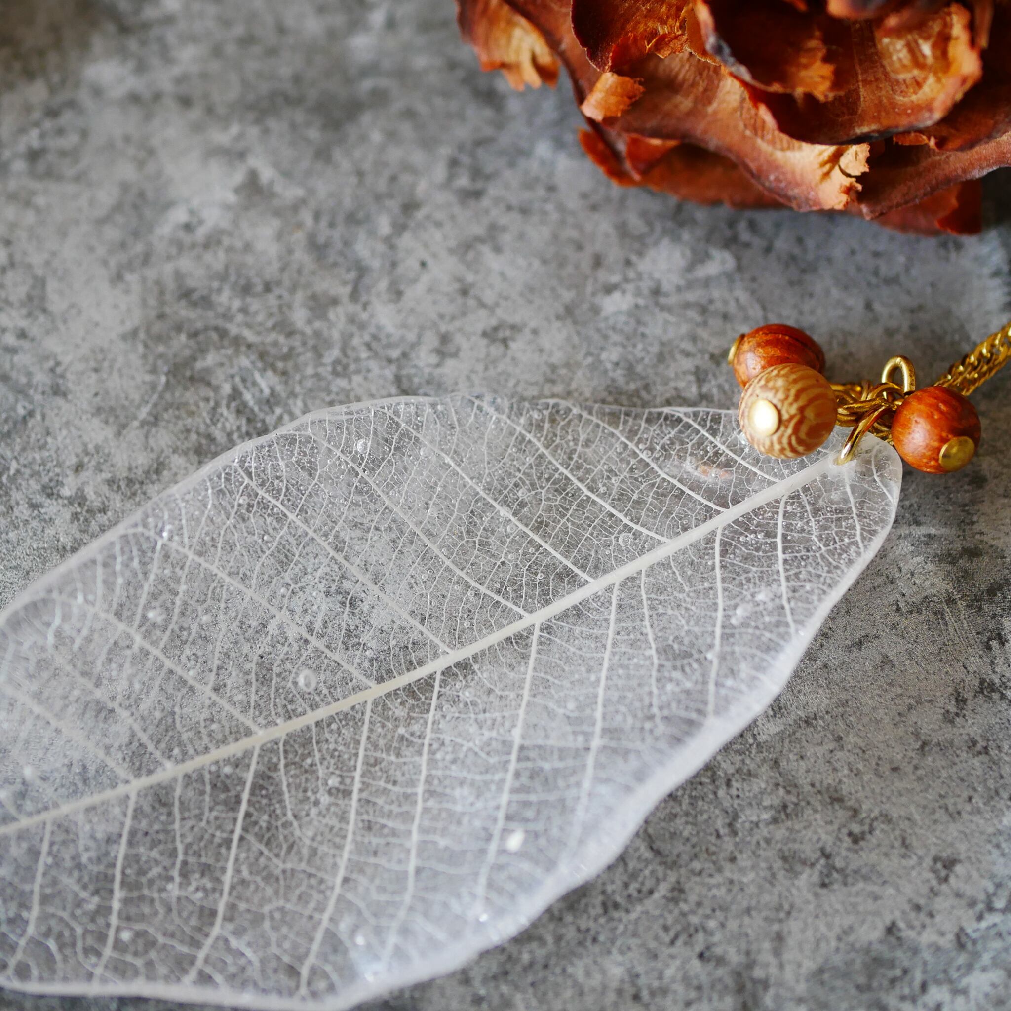 葉脈だけ残した葉っぱを、樹脂でコーティングした本物のリーフのネックレス。