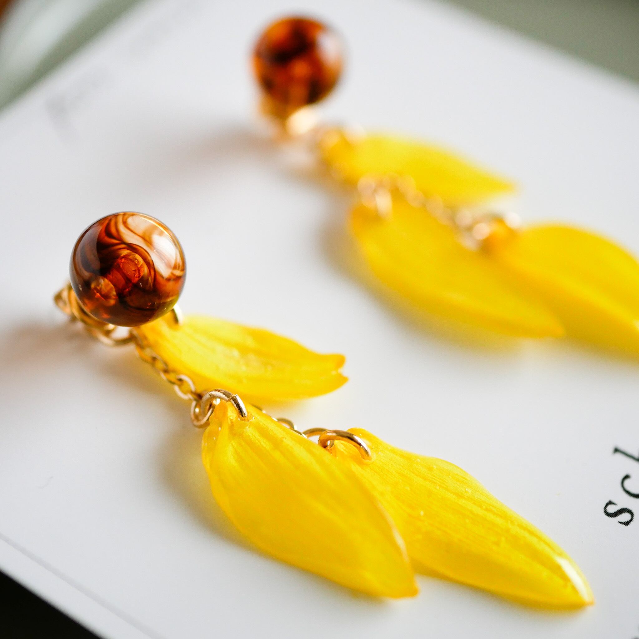 本物の向日葵の花びらで作った、夏にぴったりなピアス。