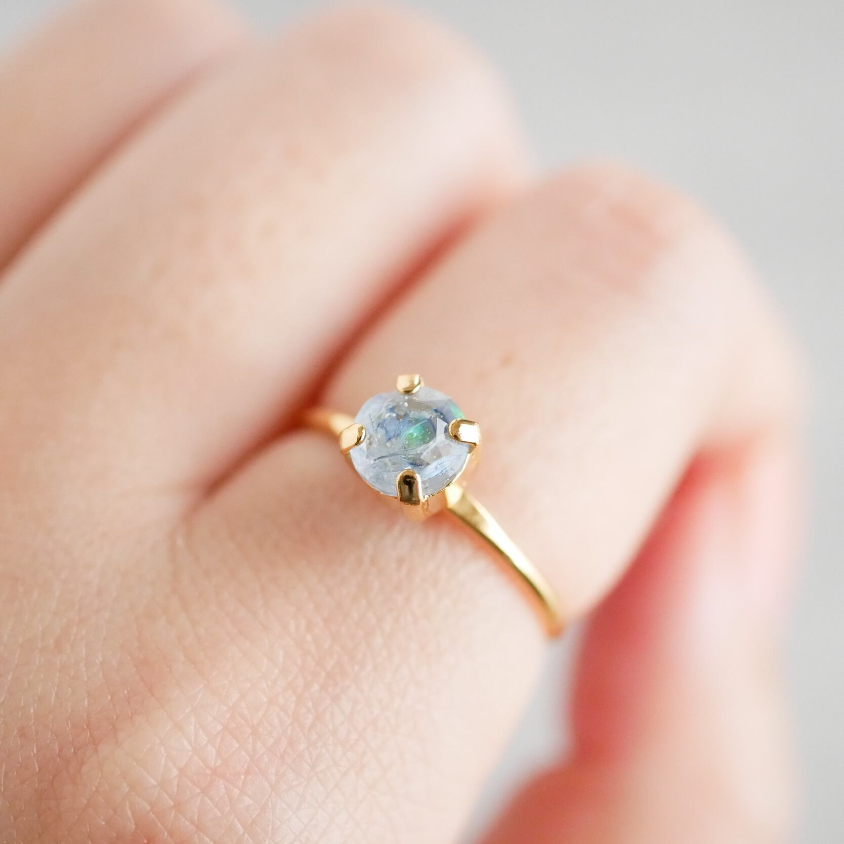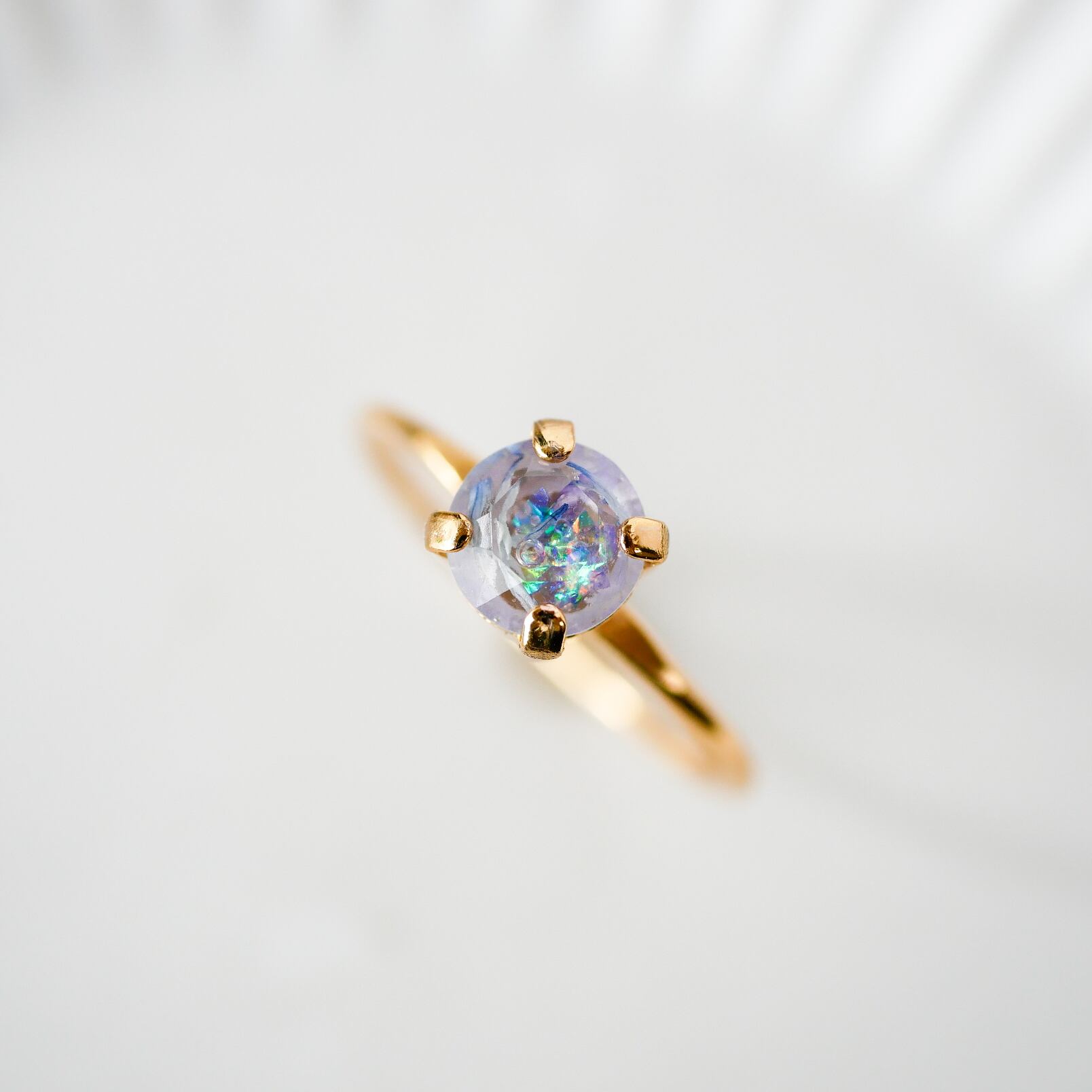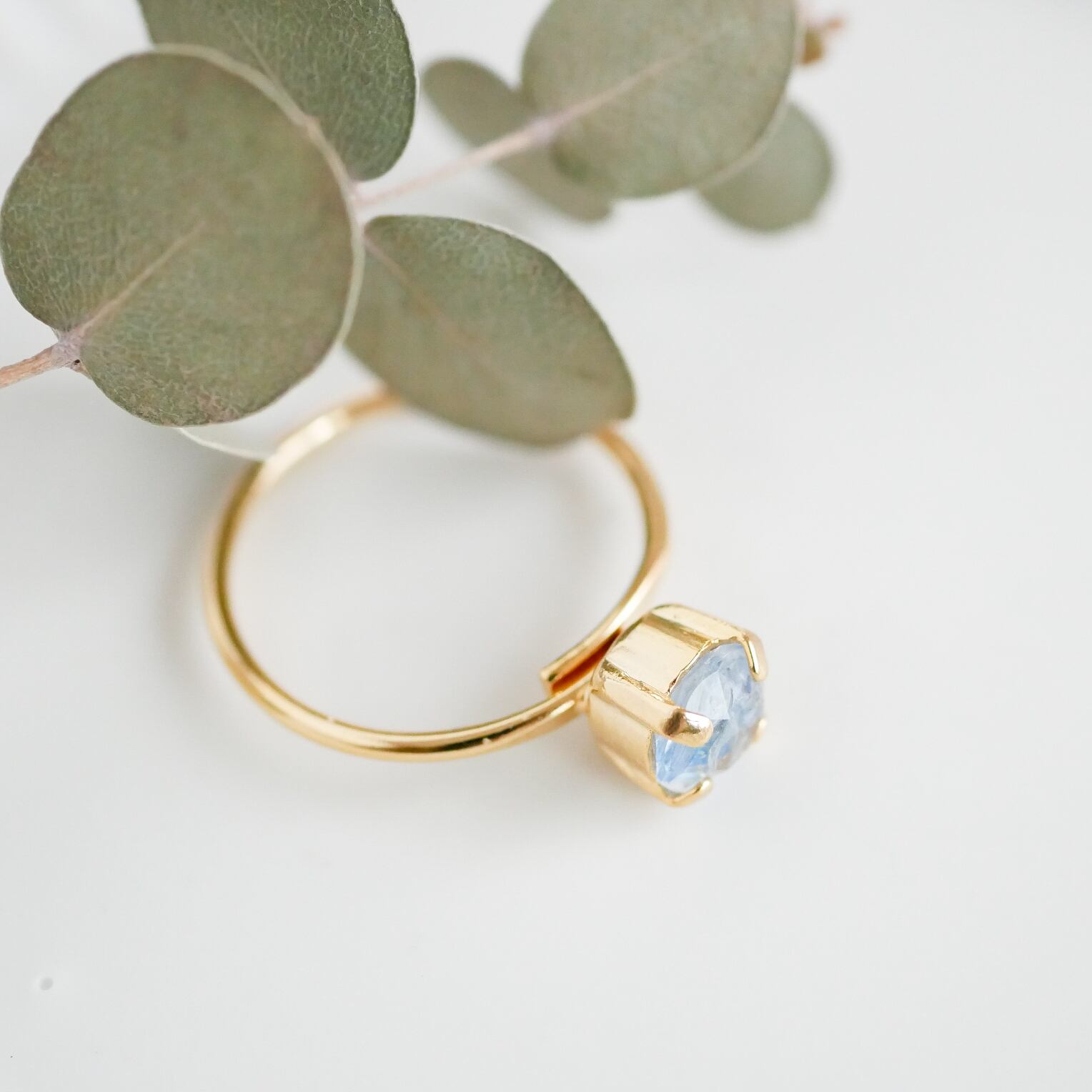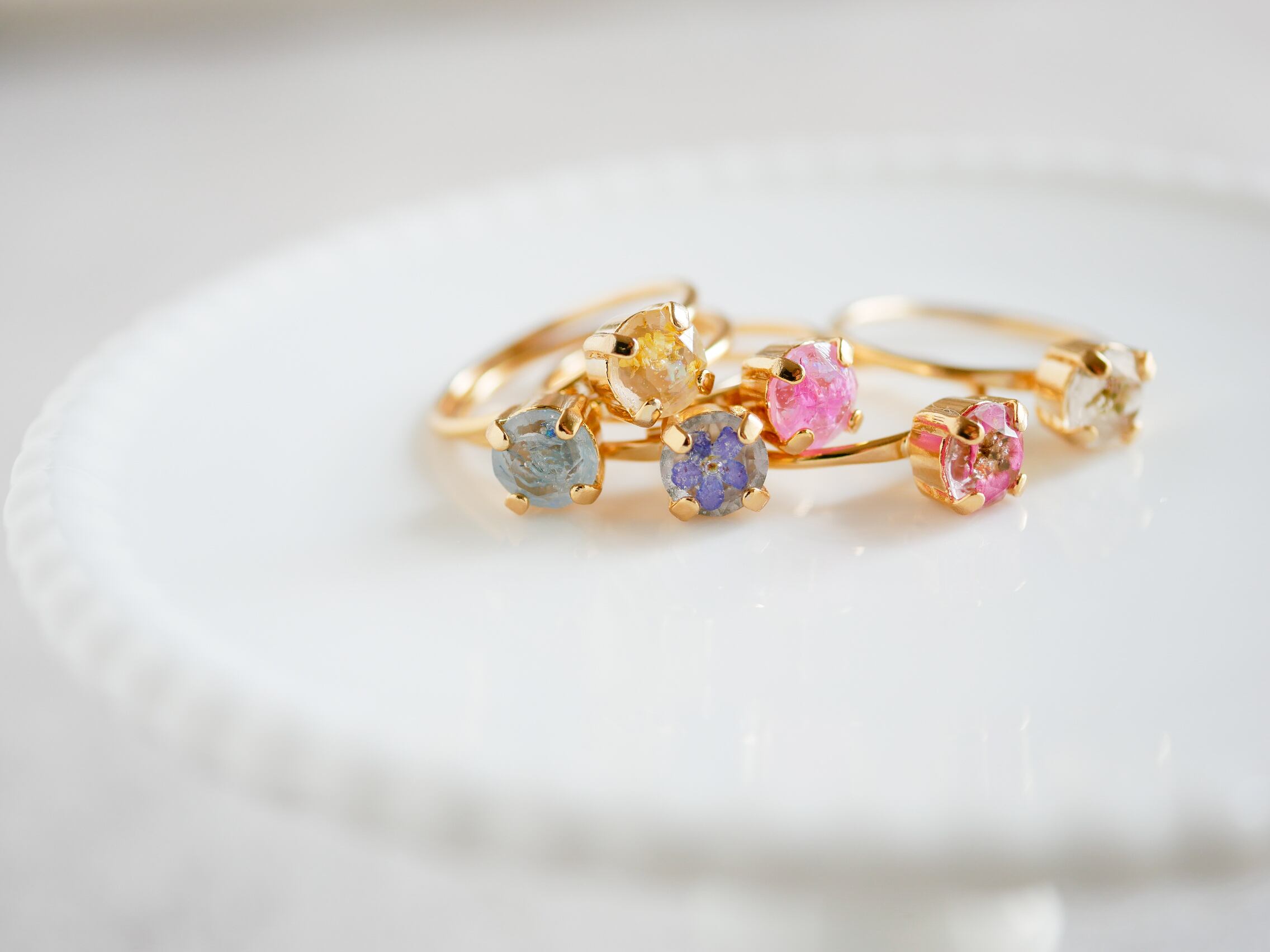 水色に染めたかすみ草のドライフラワーを小さな粒の中に樹脂で閉じ込めた指輪。
