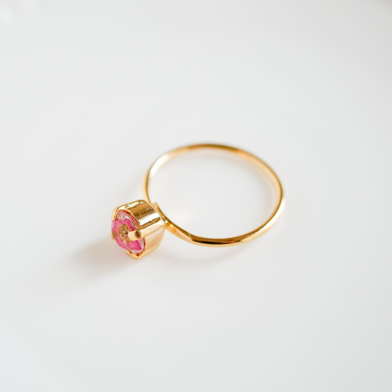 2021年春に育てたピンク色のアリッサムをドライフラワーにして、小さな粒の中に樹脂で閉じ込めた指輪。