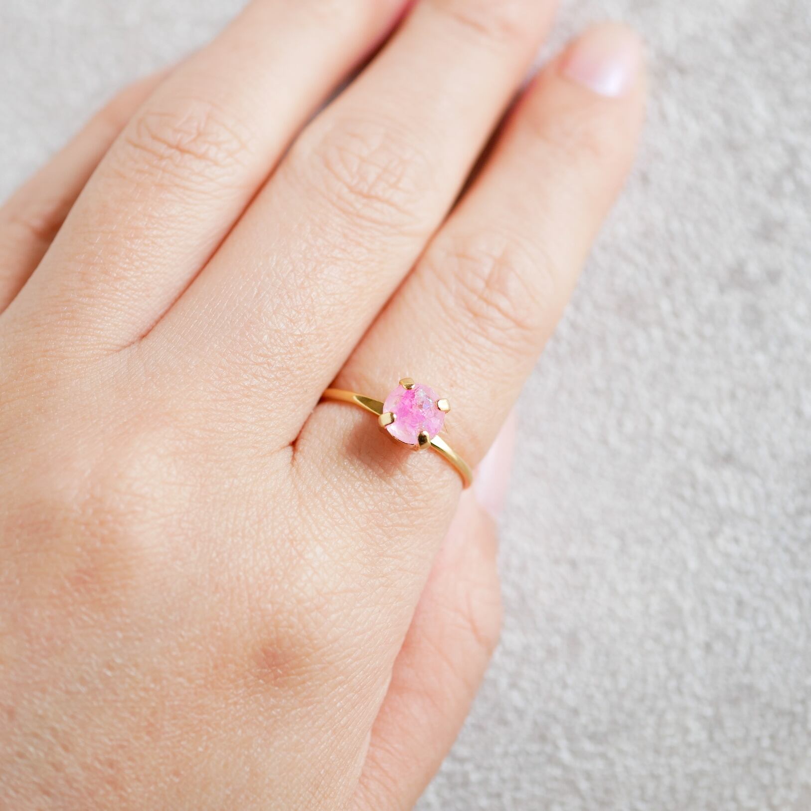 ピンク色に染めたかすみ草のドライフラワーを小さな粒の中に樹脂で閉じ込めた指輪。