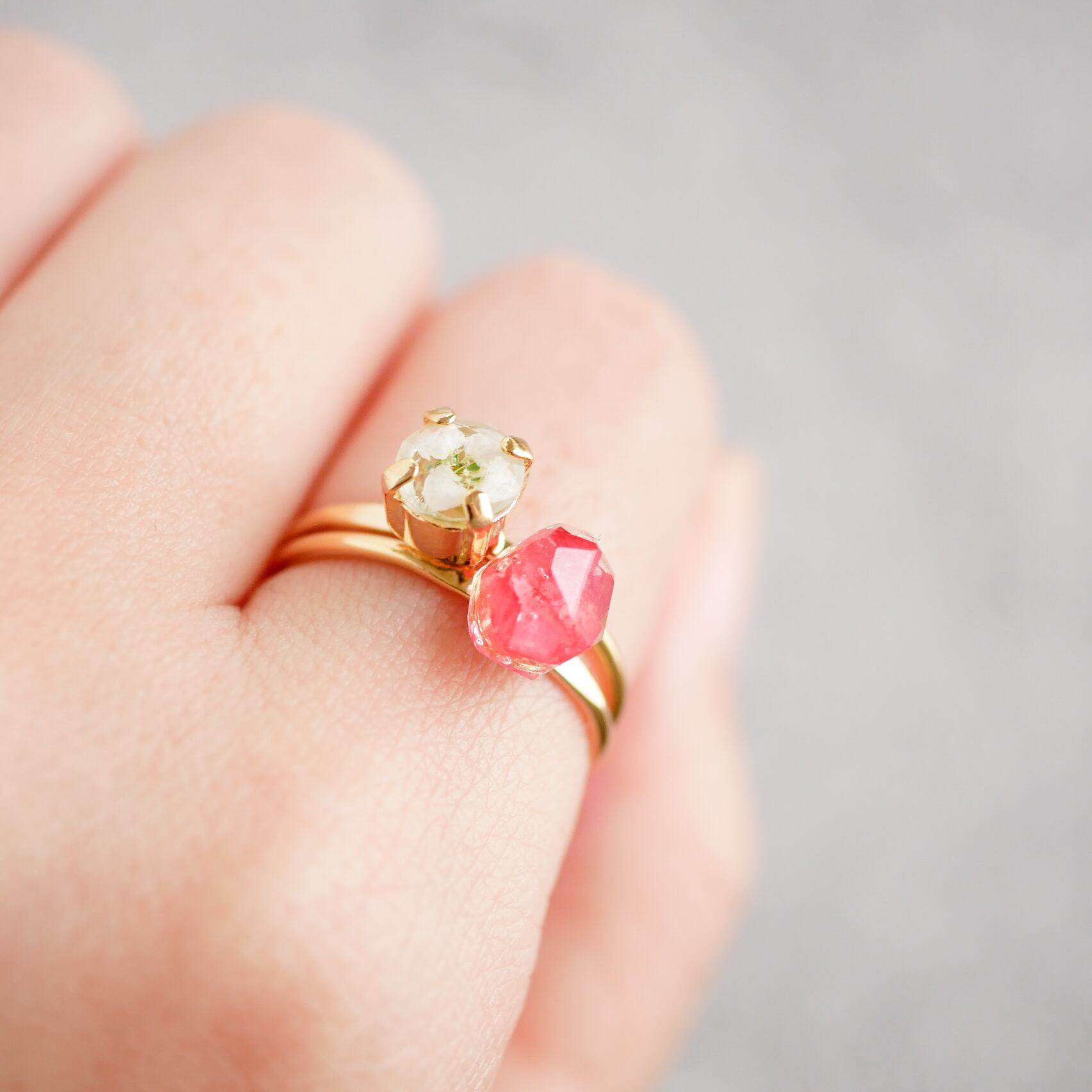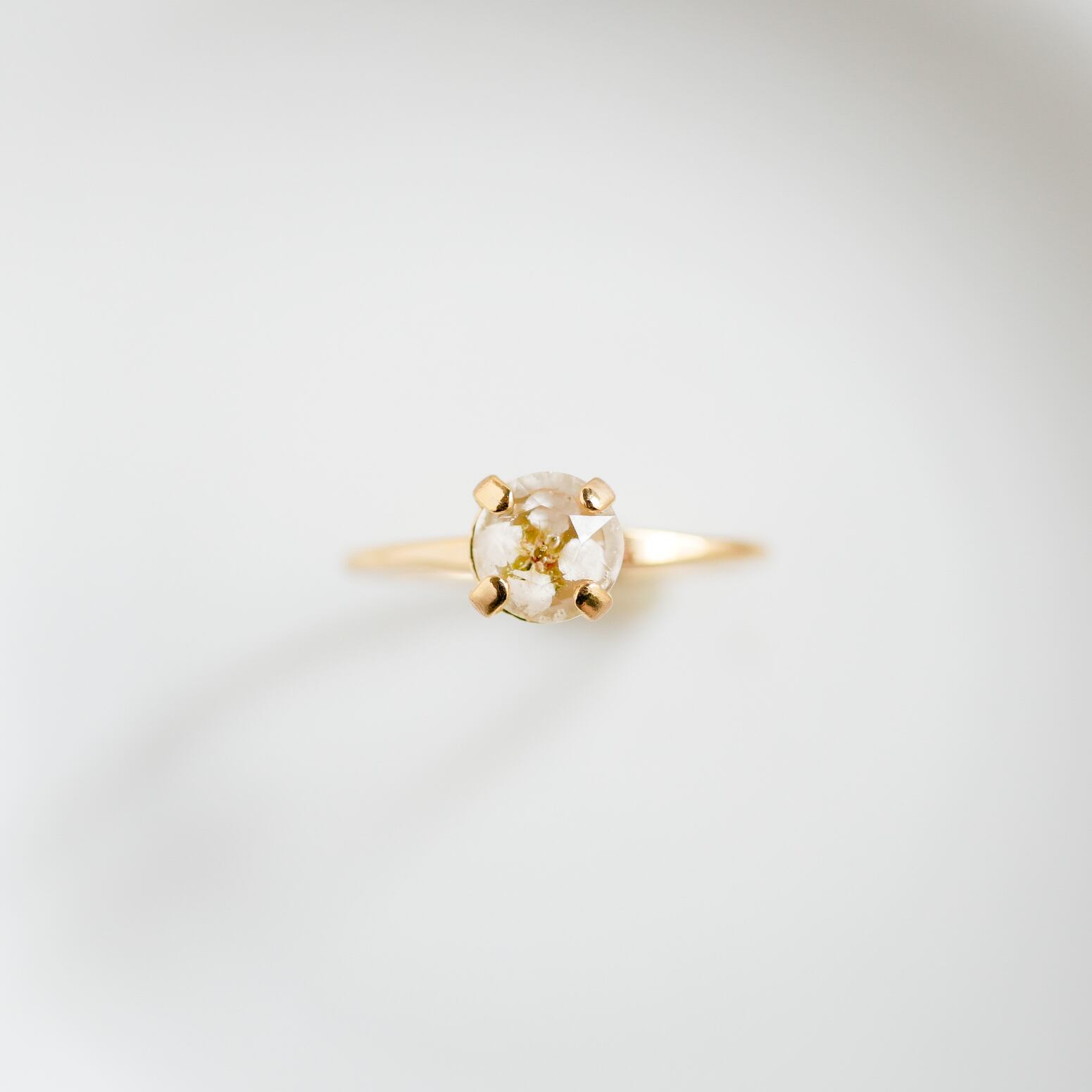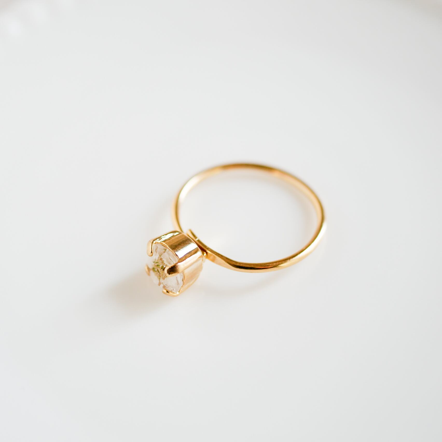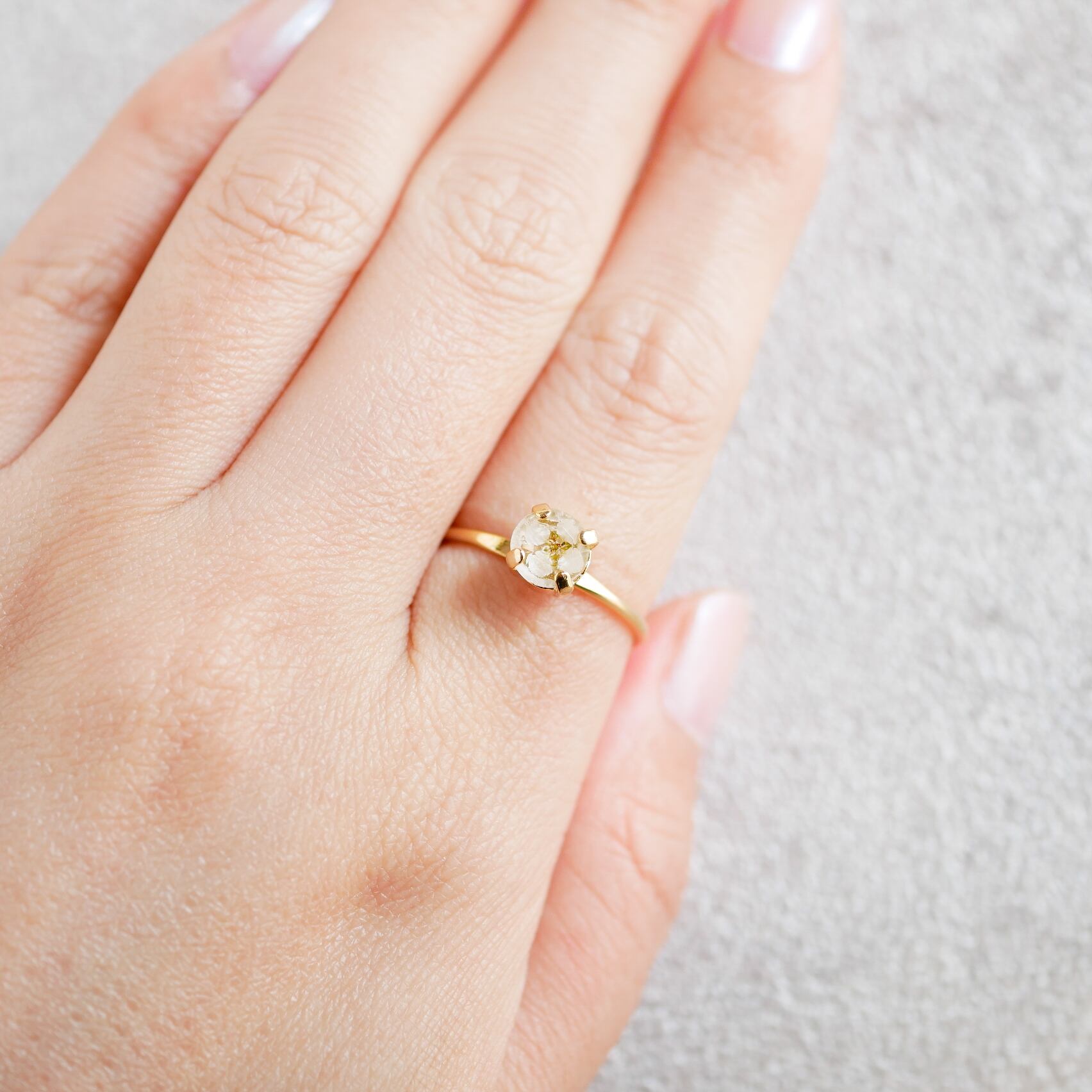 2021年春に育てたホワイトカラーのアリッサムをドライフラワーにして、小さな粒の中に樹脂で閉じ込めた指輪。