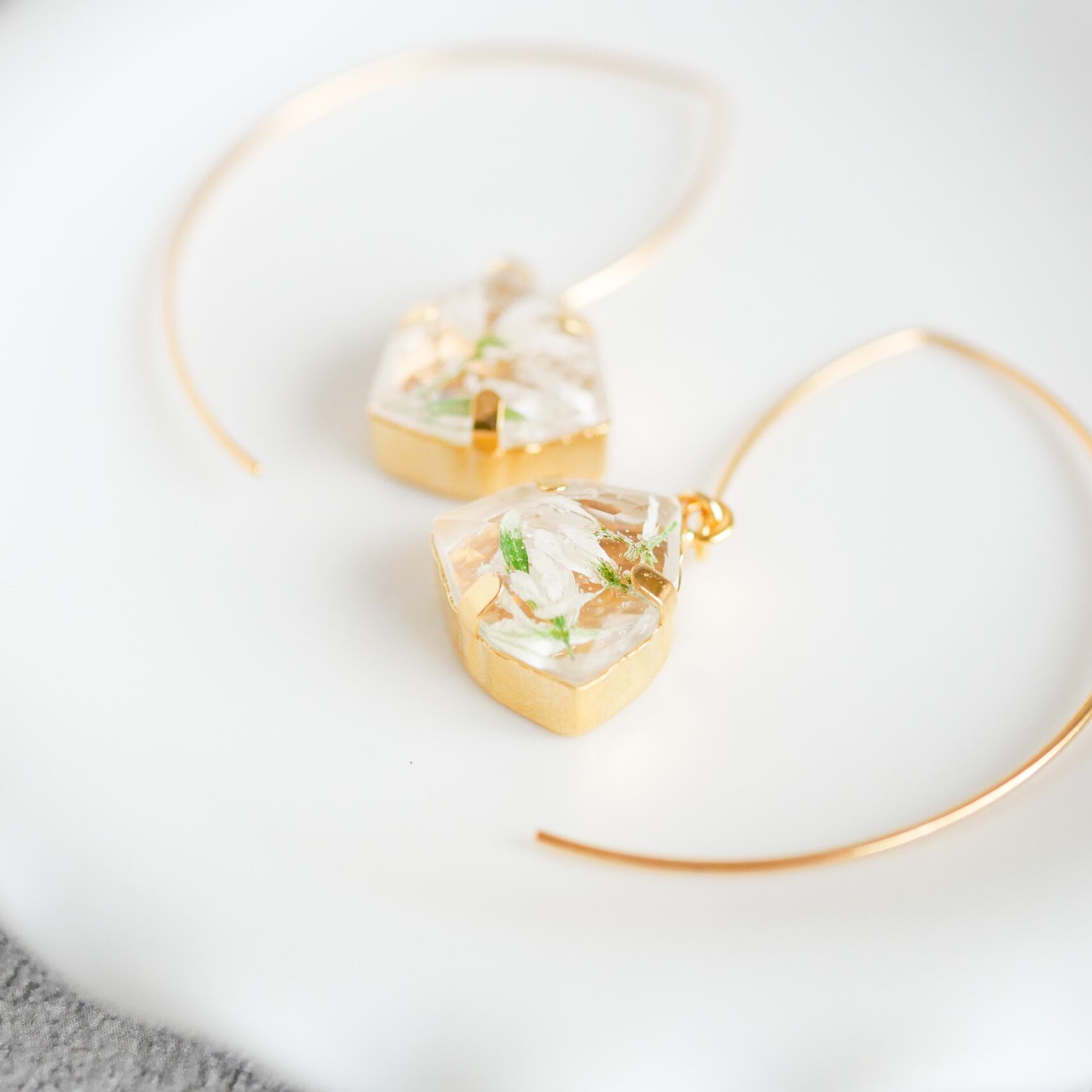 白いお花に見えますが、実はお花の部分はとても小さく、白い花びらに見える部分は葉っぱです。ある程度大きさのあるビジューとのバランスがとてもよく、樹脂の透明な部分が余白となり、1つ1つの個性も楽しめます。