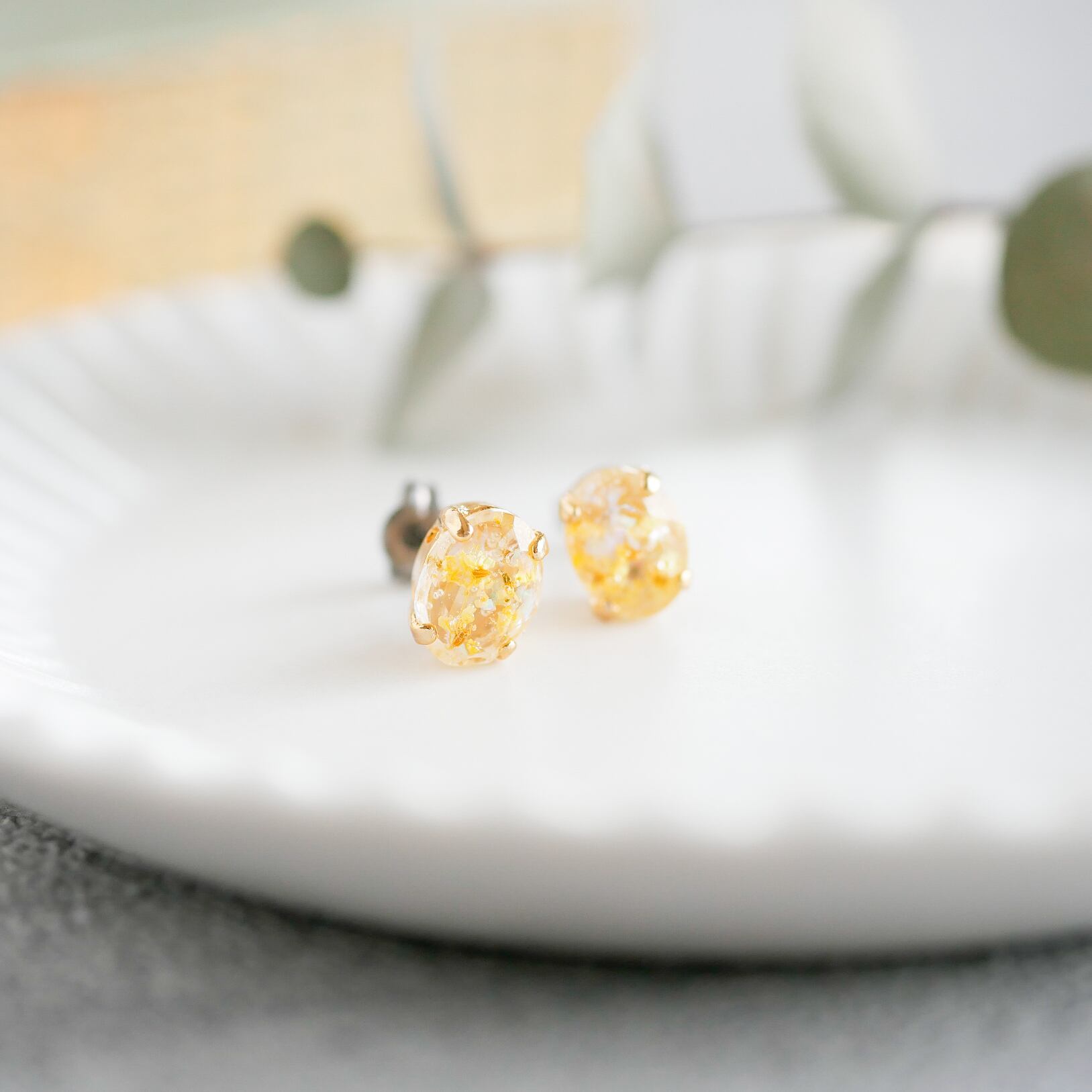 小さな小粒の中に、レースフラワーの細かなお花と京都オパール(人工樹脂)を入れています。京都オパールは少量でもとても綺麗に輝くので、着けたときに耳元のポイントになります。お花もよく見ないと分からないほどの小ささなので、お花の可愛さが苦手な方でも気軽に取り入れられるフラワーアクセサリー。黄色いお花は肌にも馴染みやすく悪目立ちしないので、使い勝手もよいカラーです。