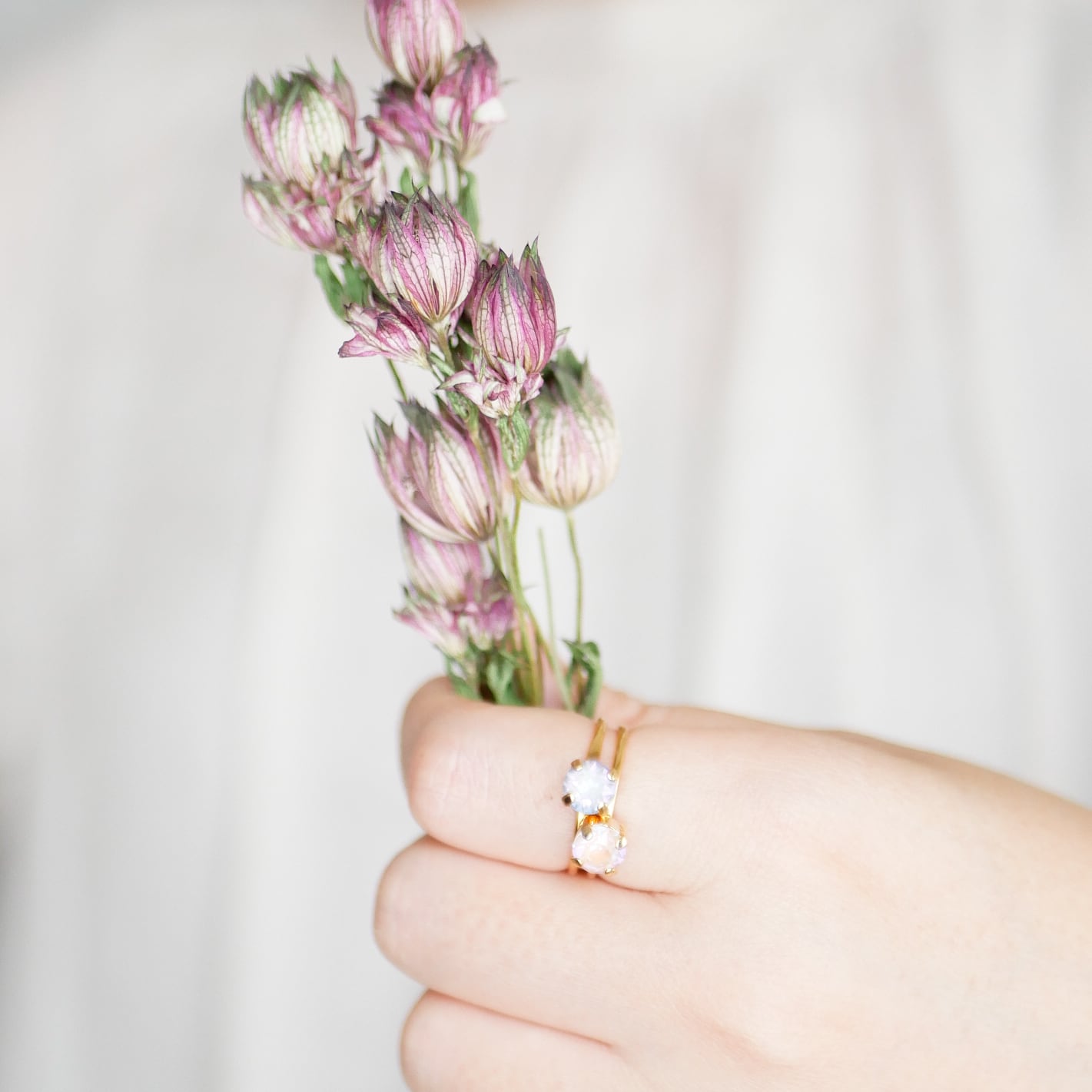その日のコーディネートに合わせて、お手持ちのリングや同シリーズの他カラーと組み合わせて重ねづけコーディネートを考えるのも楽しくておすすめ。