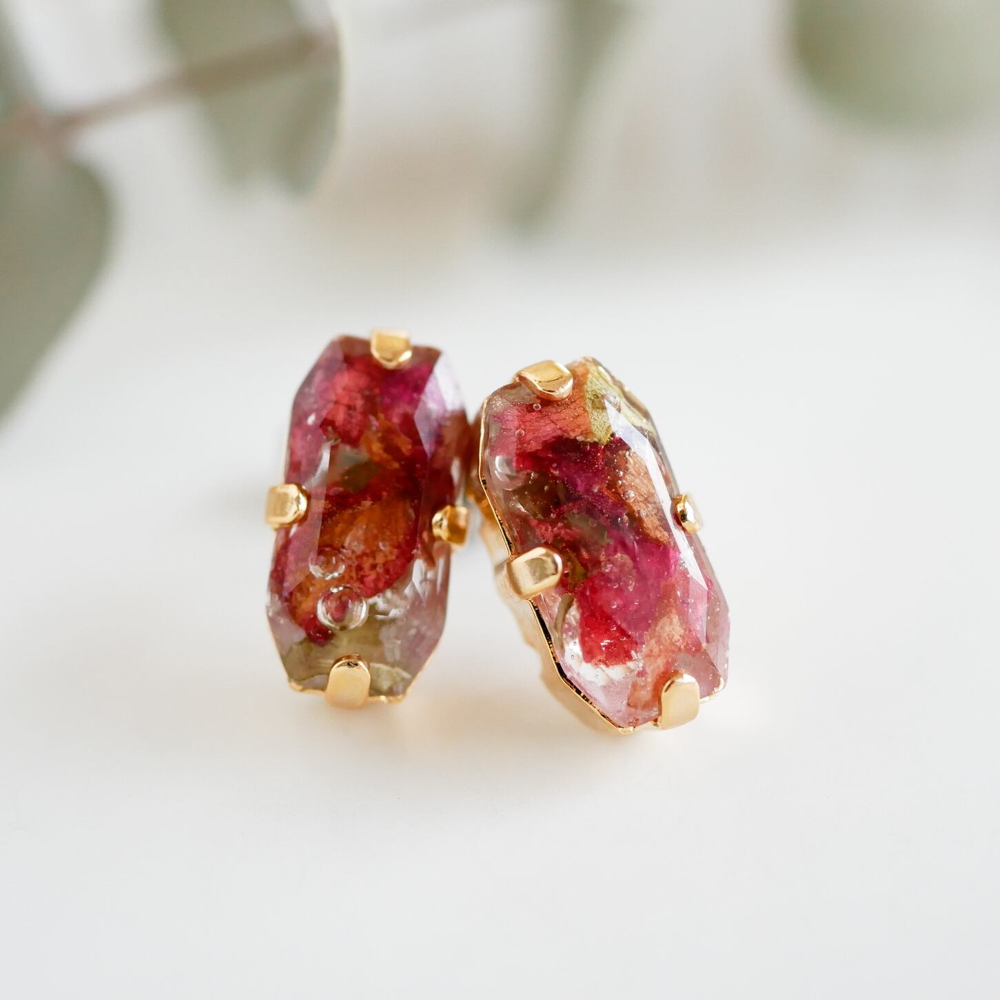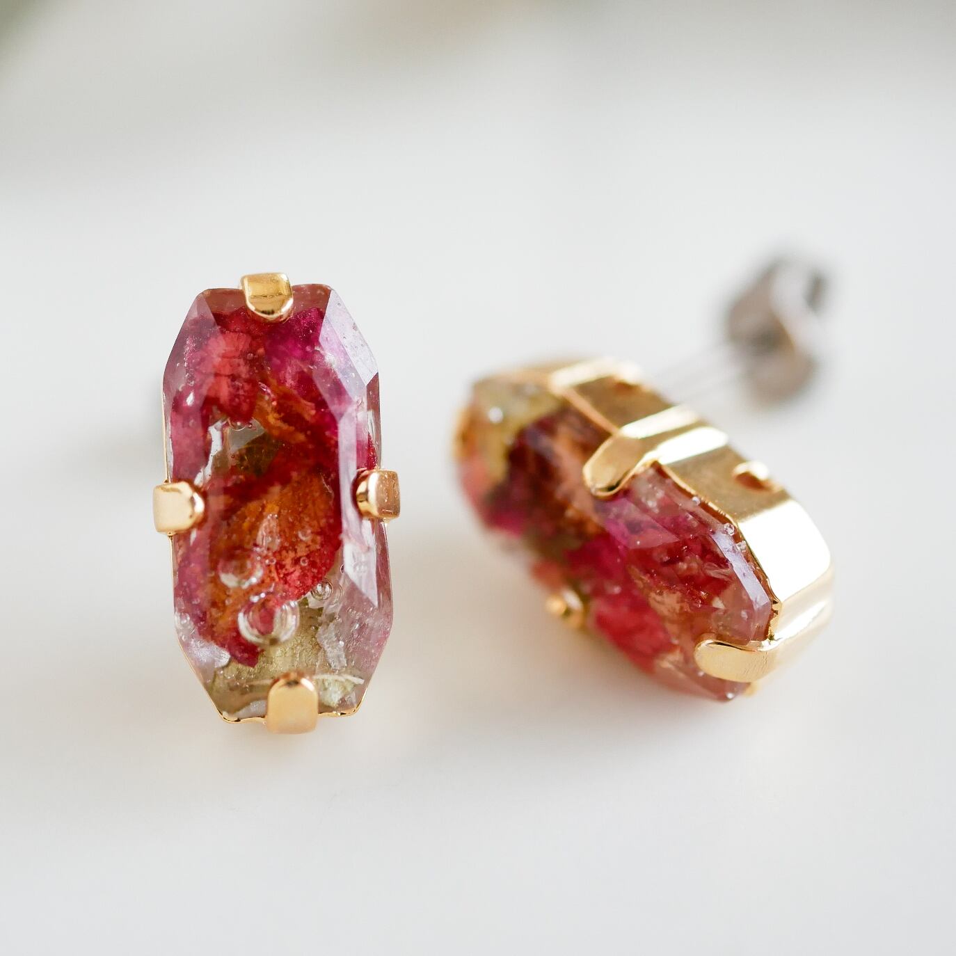 宝石のエメラルドのカッティングとして有名なアッシャーカットをベースにした小粒のパーツに、薔薇の花びらを閉じ込めたビジュー風の小粒ピアス。