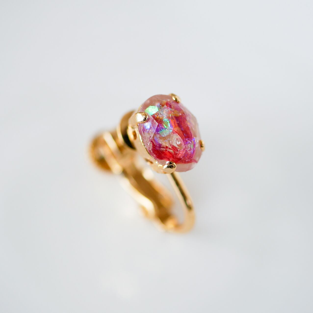 片方は鮮やかな紫色のオーストリア産の高級ガラスクリスタルで、もう片方は濃いピンクをドライフラワーにしたジニアの花弁を封入した樹脂パーツを組み合わせた、左右アシンメトリーカラーのイヤリングです。