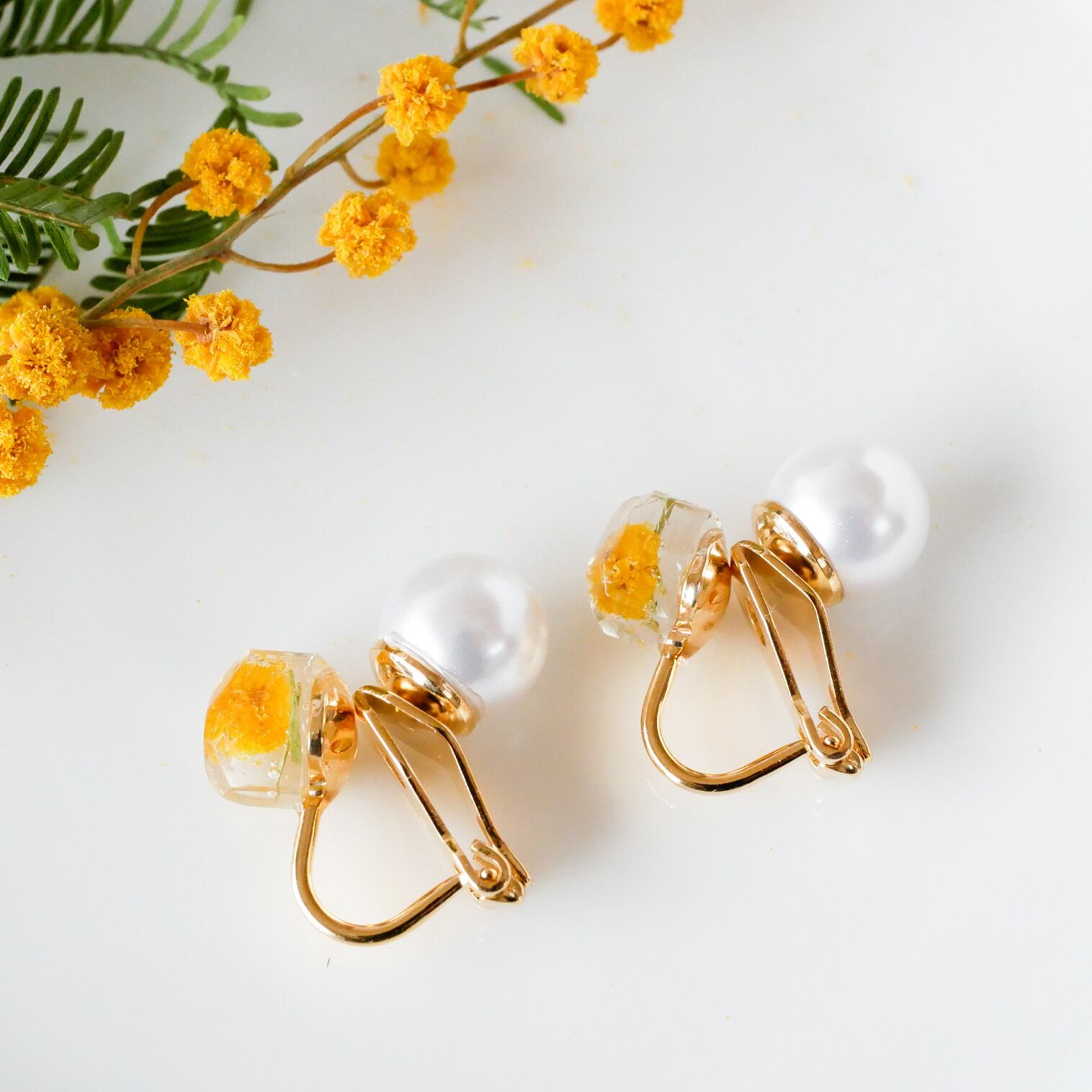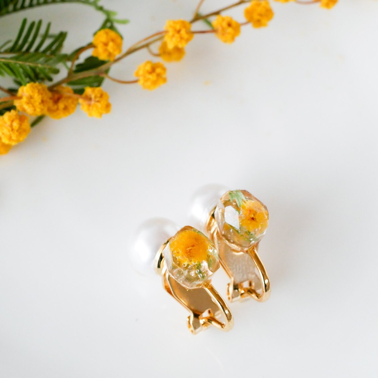 ミモザのドライフラワーを小さな鉱石の型に樹脂で閉じ込めた小粒イヤリングです。