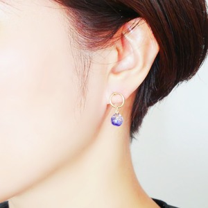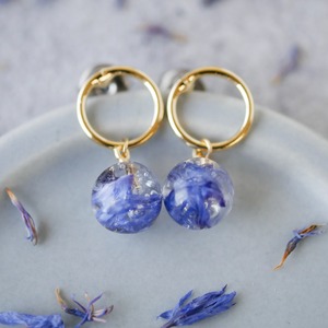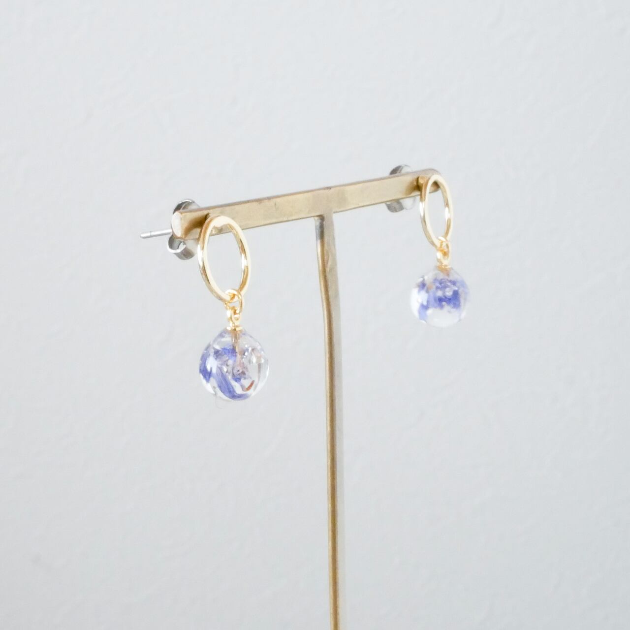 約1センチのゴールドフープと、ドライフラワー入りの小粒を組み合わせた、シンプルなピアス。お花パーツは動くたびにさり気なく揺れるデザインです。