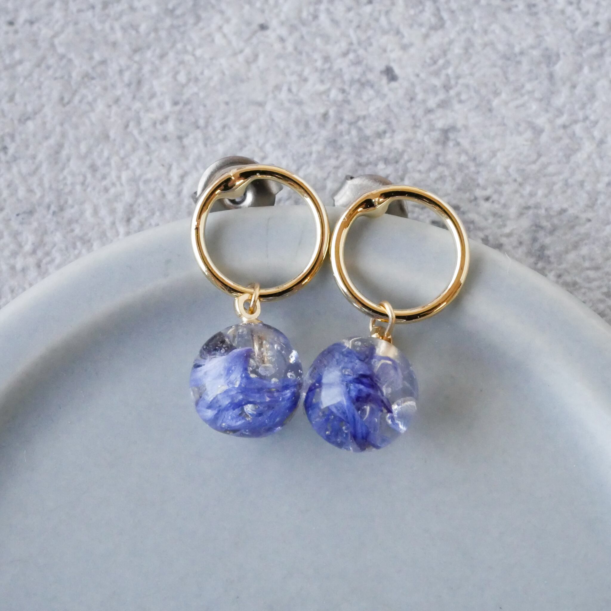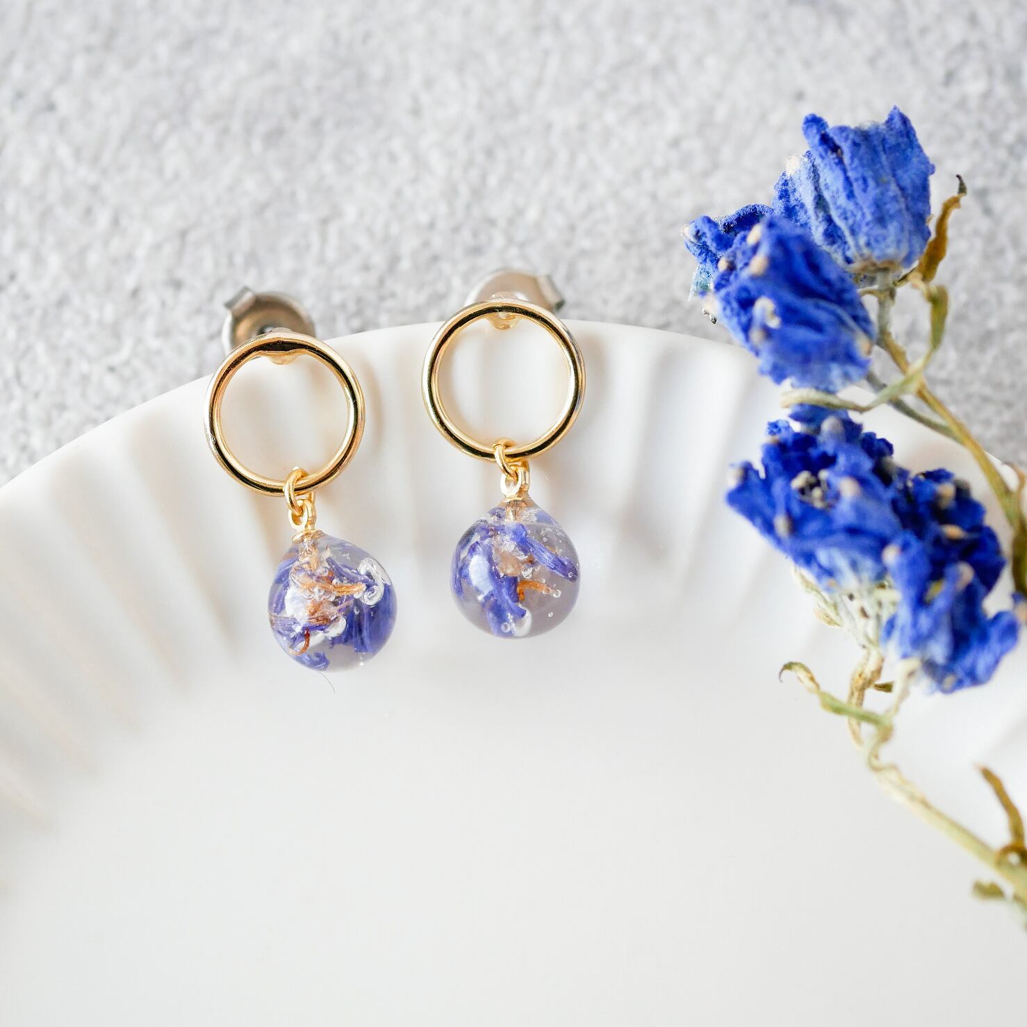 お花パーツは、矢車草(コーンフラワー)をドライフラワーにして樹脂で球体を1つ1つ作りました。