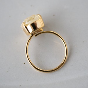 中に閉じ込めたお花は、自らドライフラワーにしたレースフラワーのお花を詰め込んでいます。小さな白いお花が敷き詰められていて、とってもきれい。お花を身に着けて楽しめる指輪です。