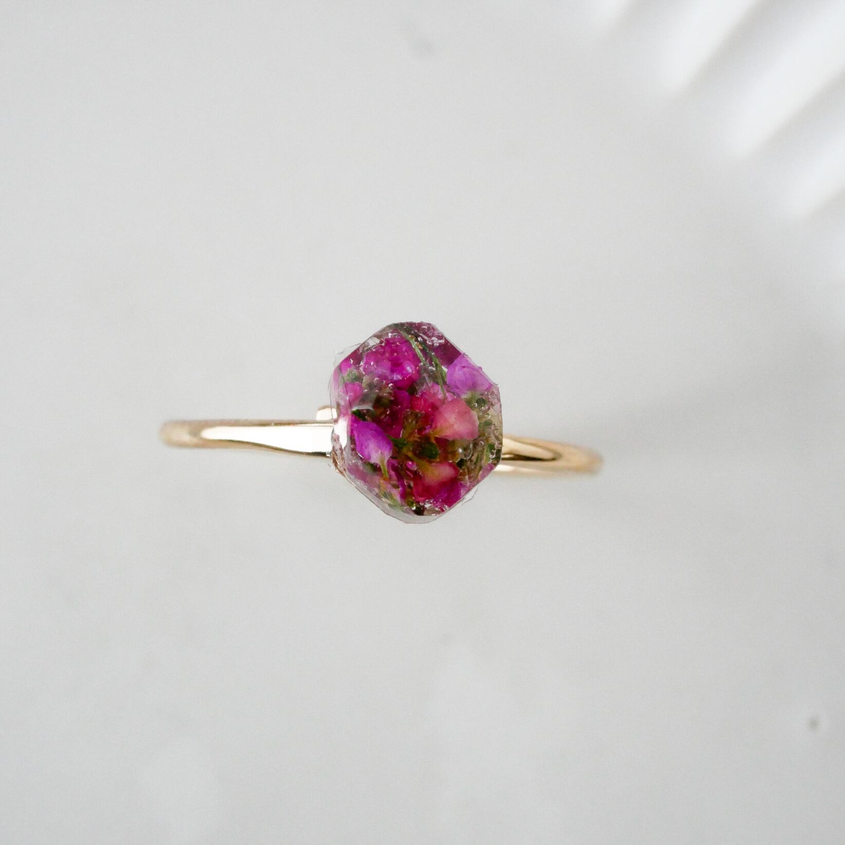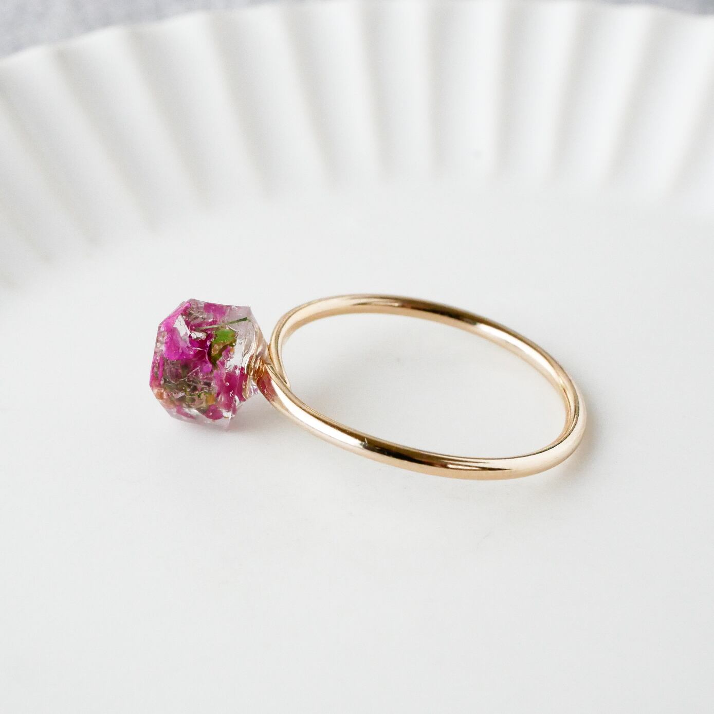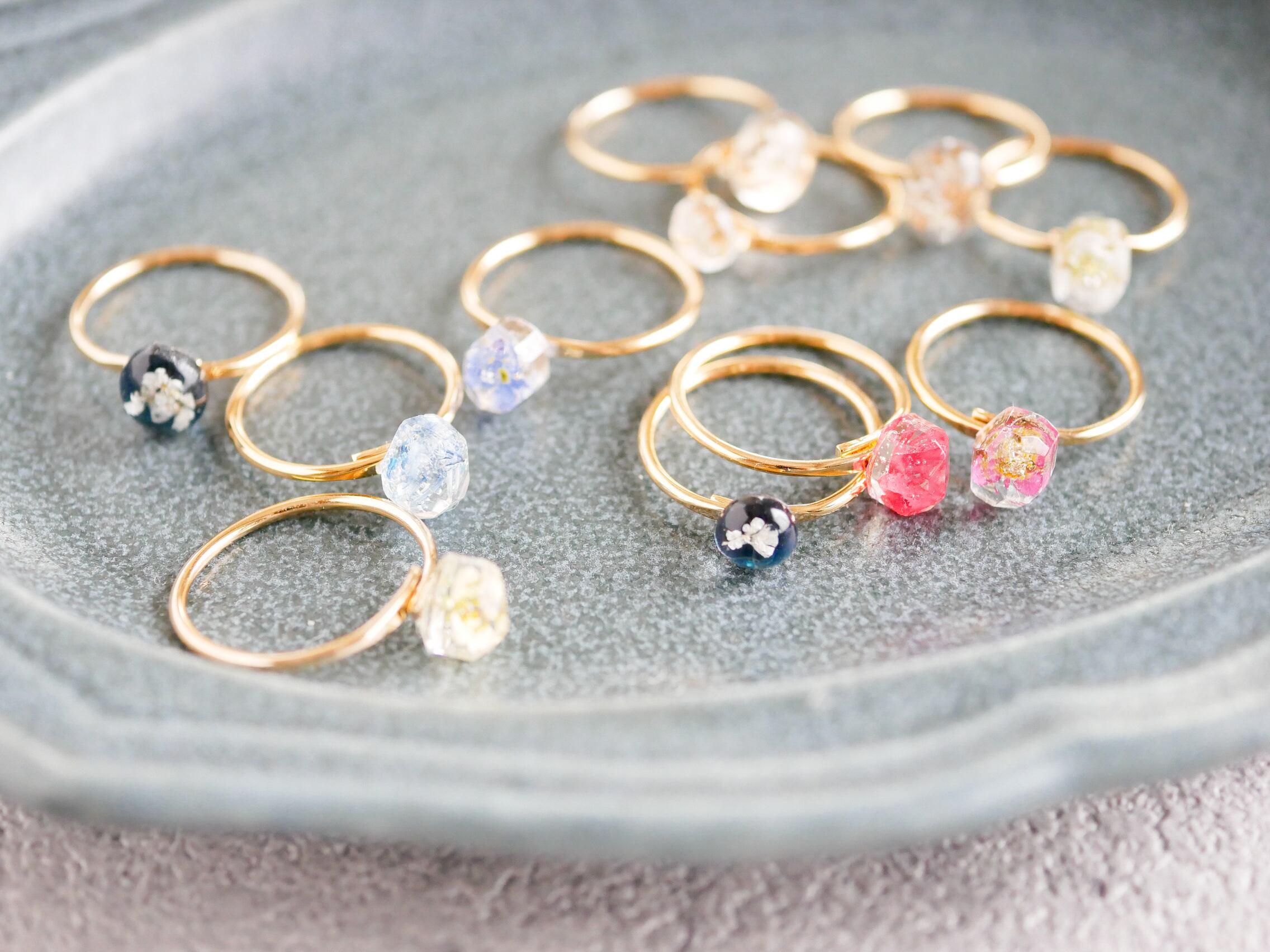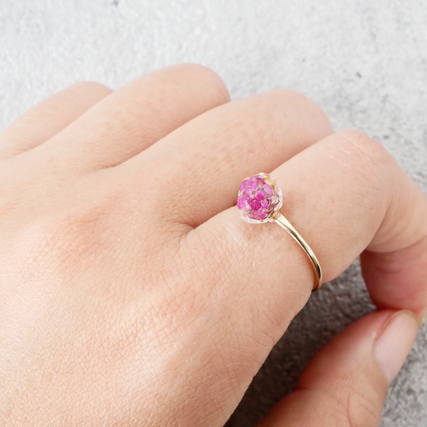 小さな小粒の中に、自宅で大事に育てたアリッサムのドライフラワーを詰め込んだ華奢なリング。