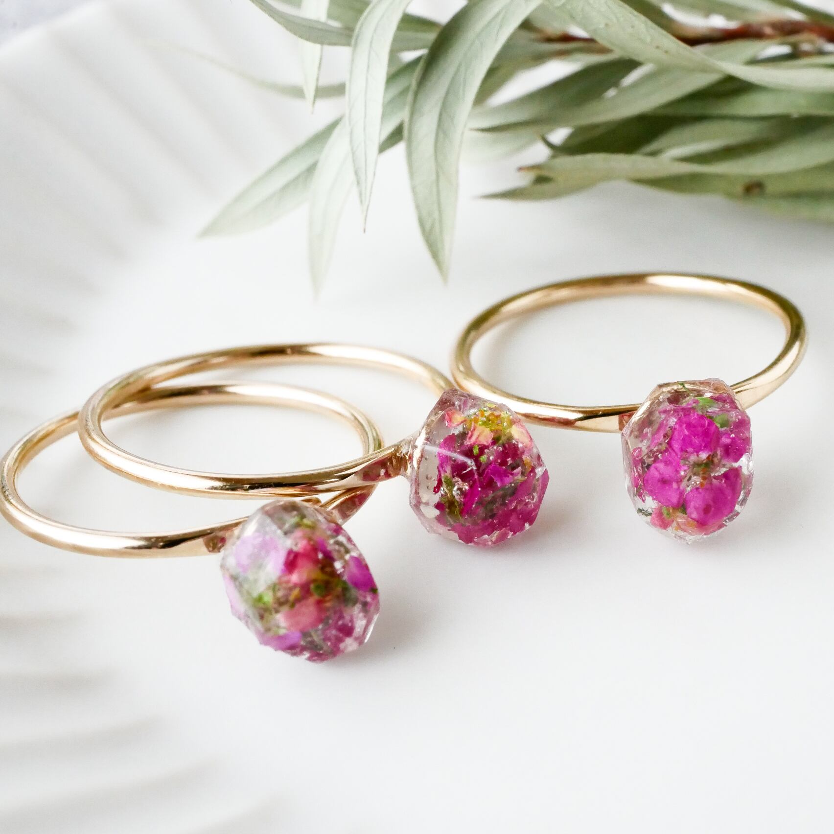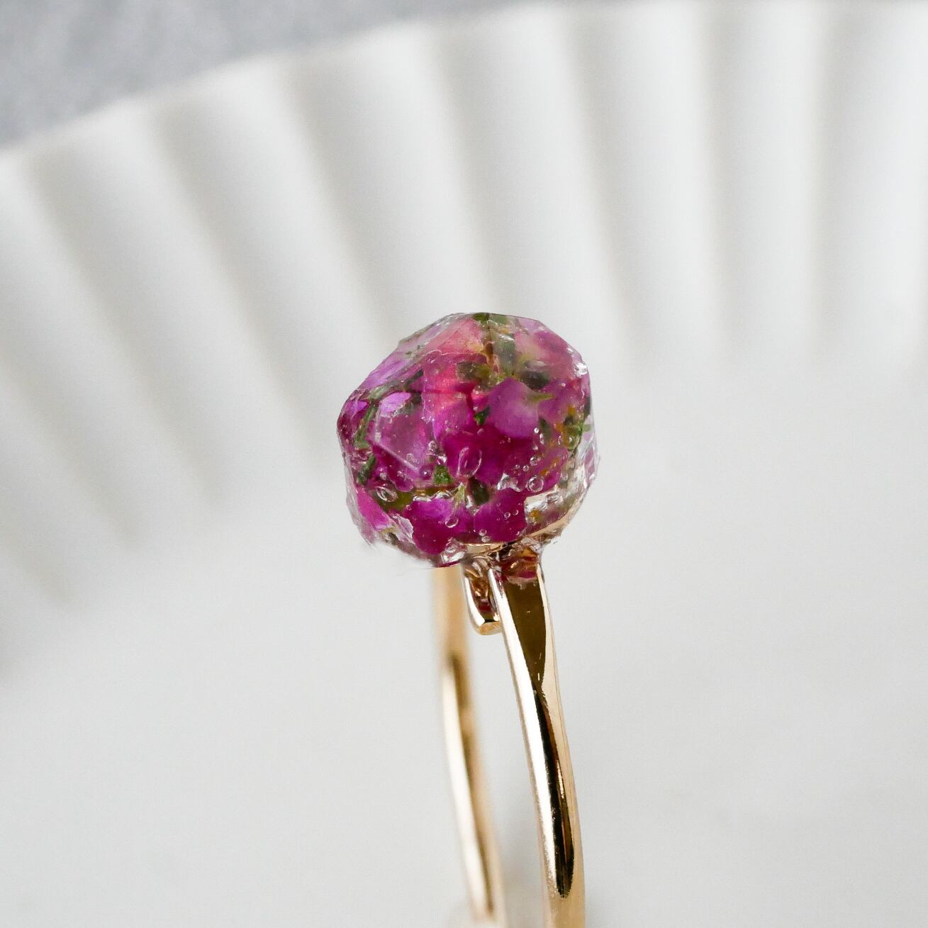 アリッサムは春に咲く小さなお花で、今回は濃い紫・ピンク系のお花を中心に詰め込みました。全て1点ものなので、指輪によっては薄い花弁が少し混ざっているものもございます。