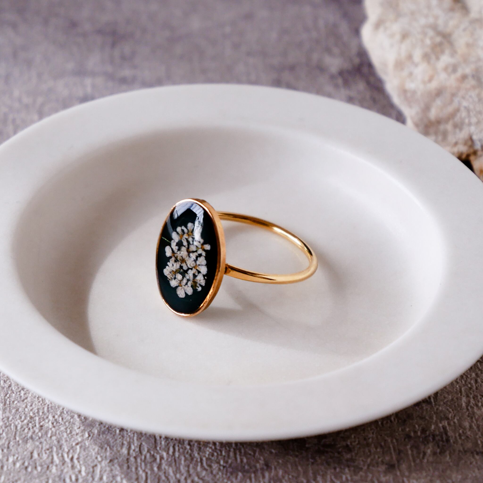 オーバル型のパーツには、レースフラワーの押し花を樹脂で閉じ込めました。