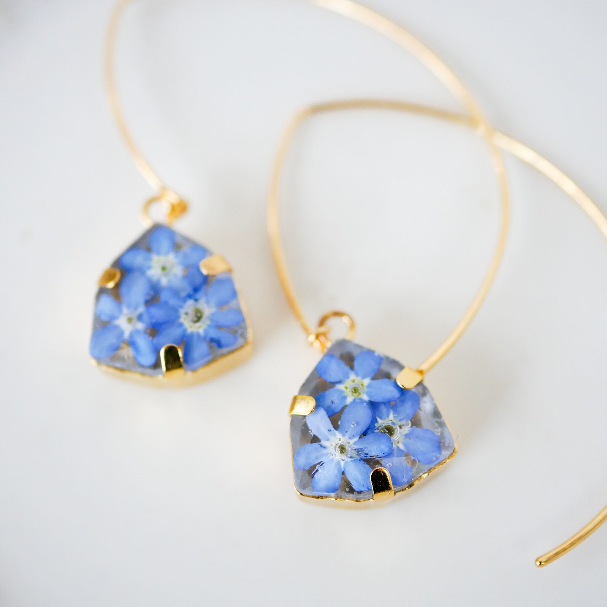 自宅で咲いた忘れなぐさをドライフラワーにして樹脂で閉じ込めたフックタイプのピアス。