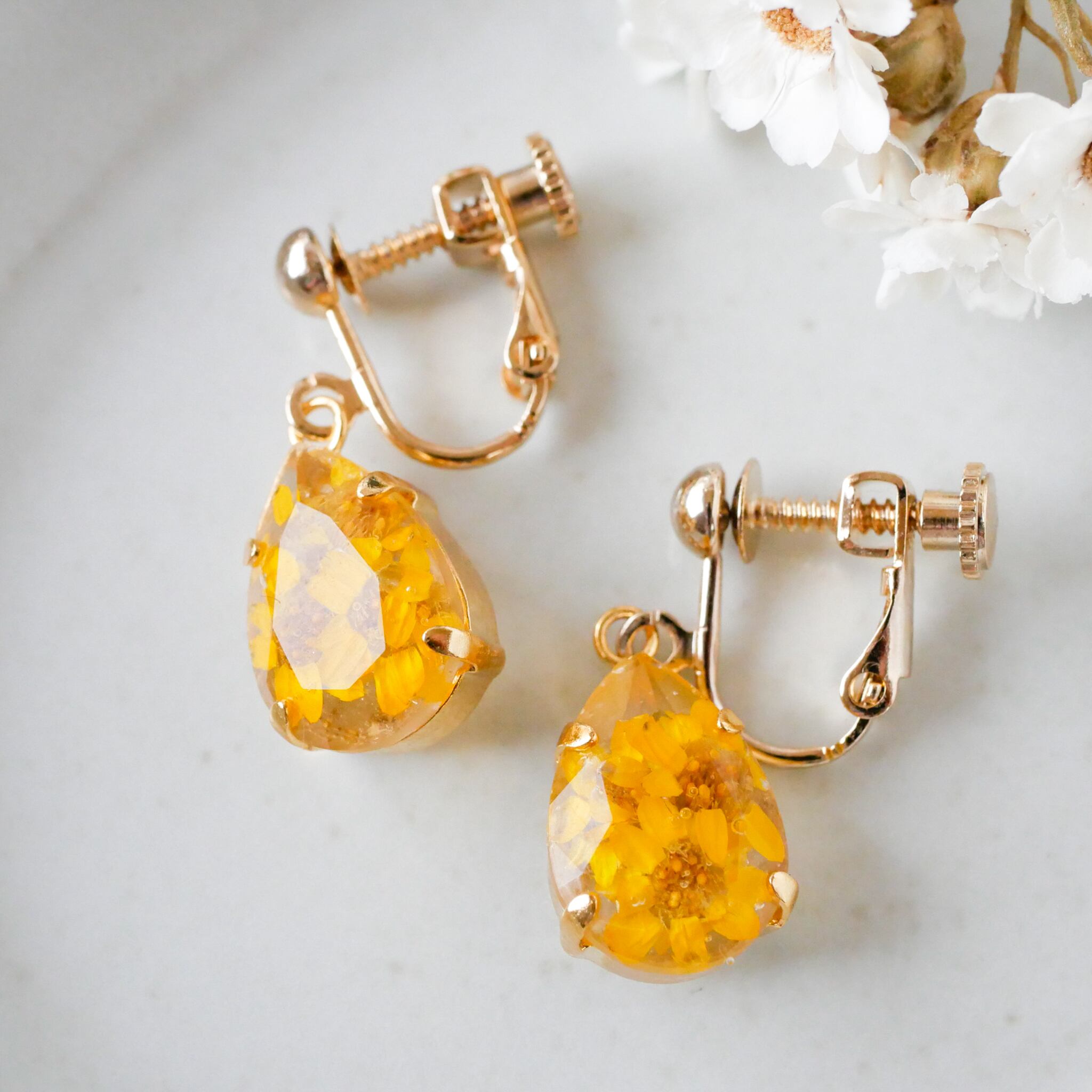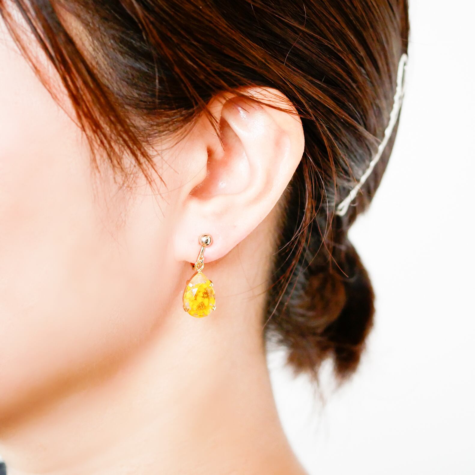 パーツの中には、鮮やかな黄色いローダンセのお花を詰め込んでいます。花びらも自然な色合いで、ビタミンカラーがとても可愛いアクセサリー。