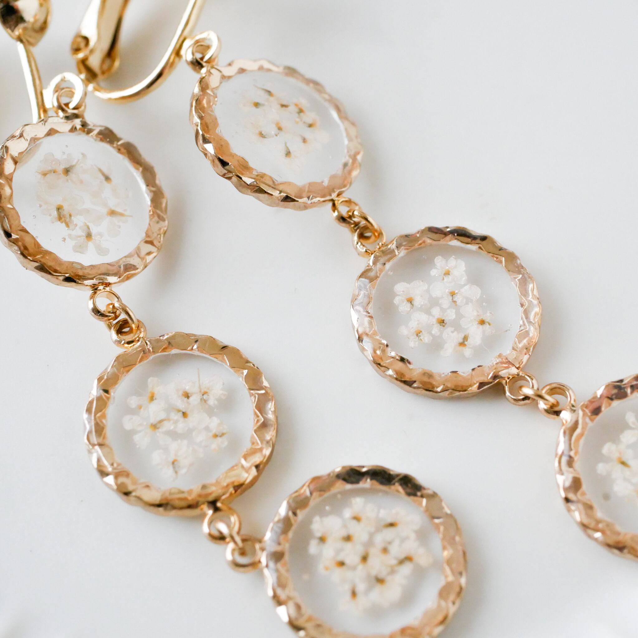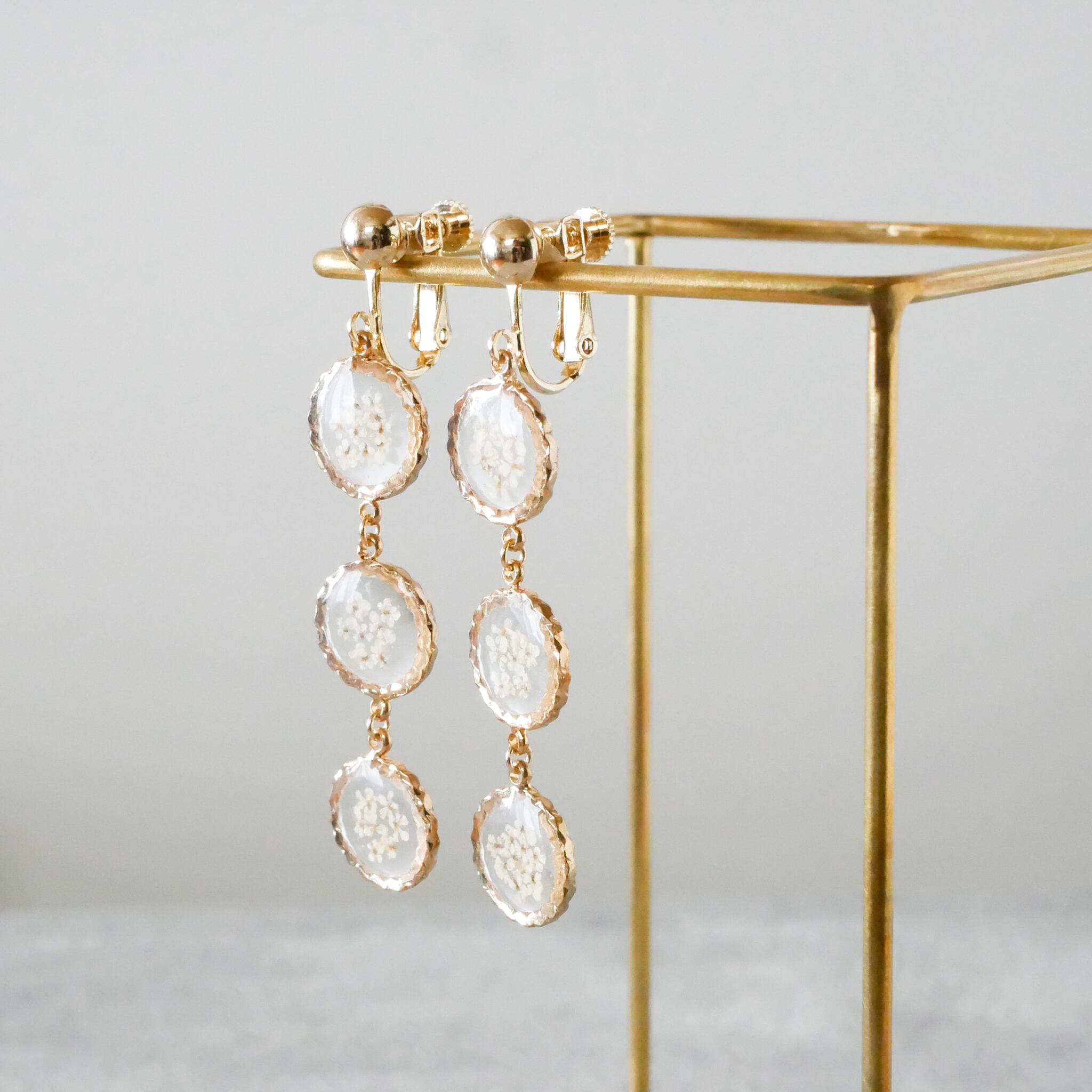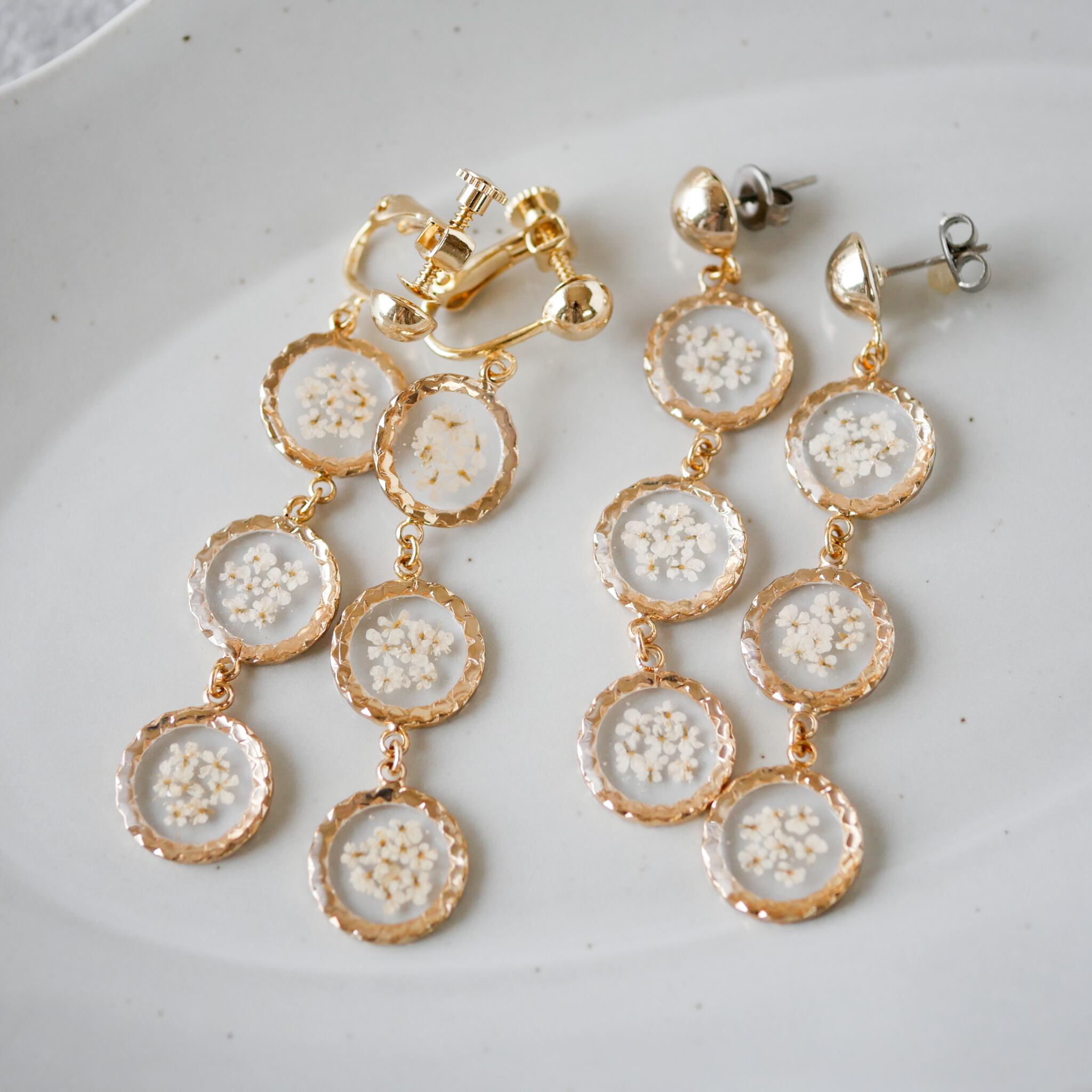 飾り模様のある輪っかのパーツの中に、レースフラワーの押し花を閉じ込めたロングイヤリング。