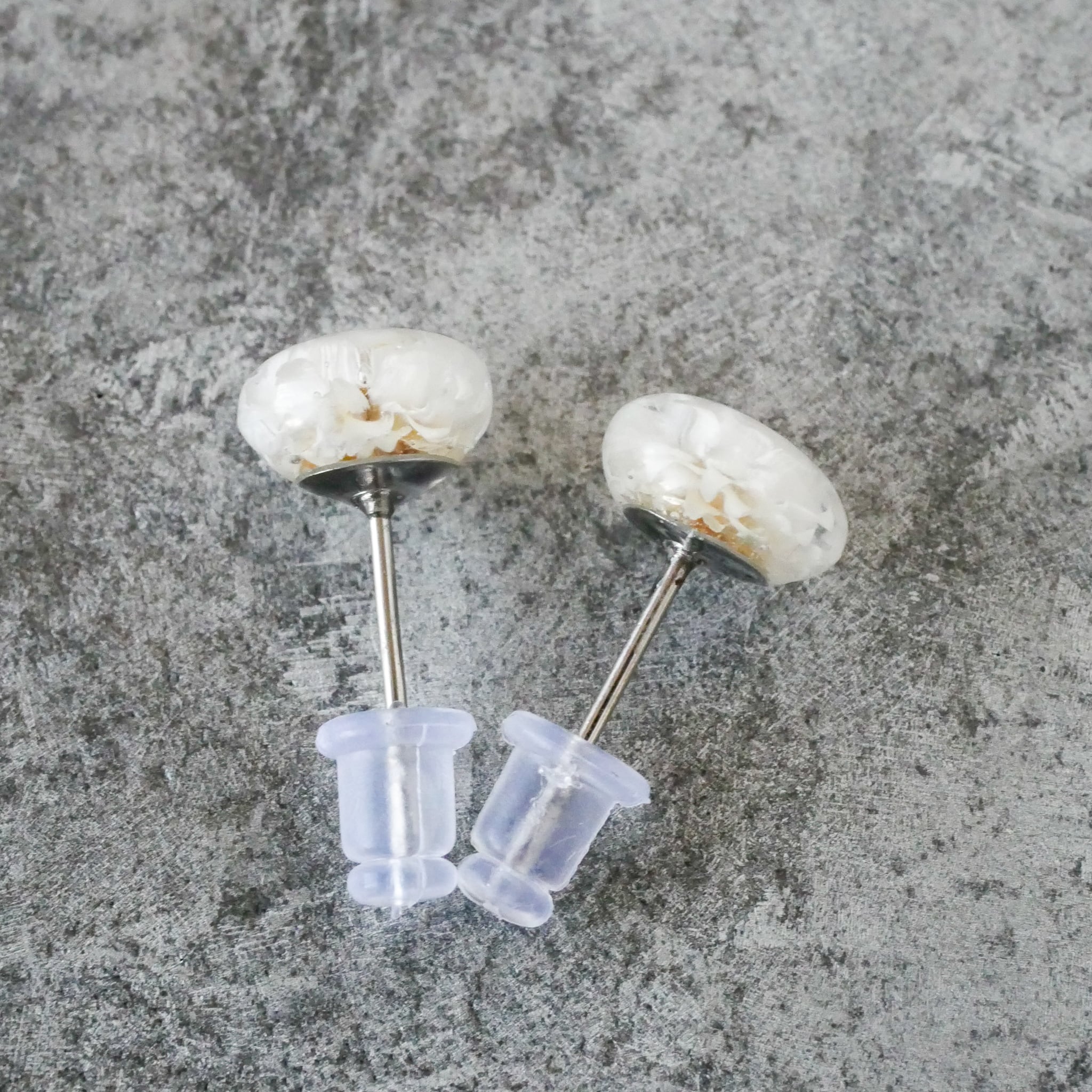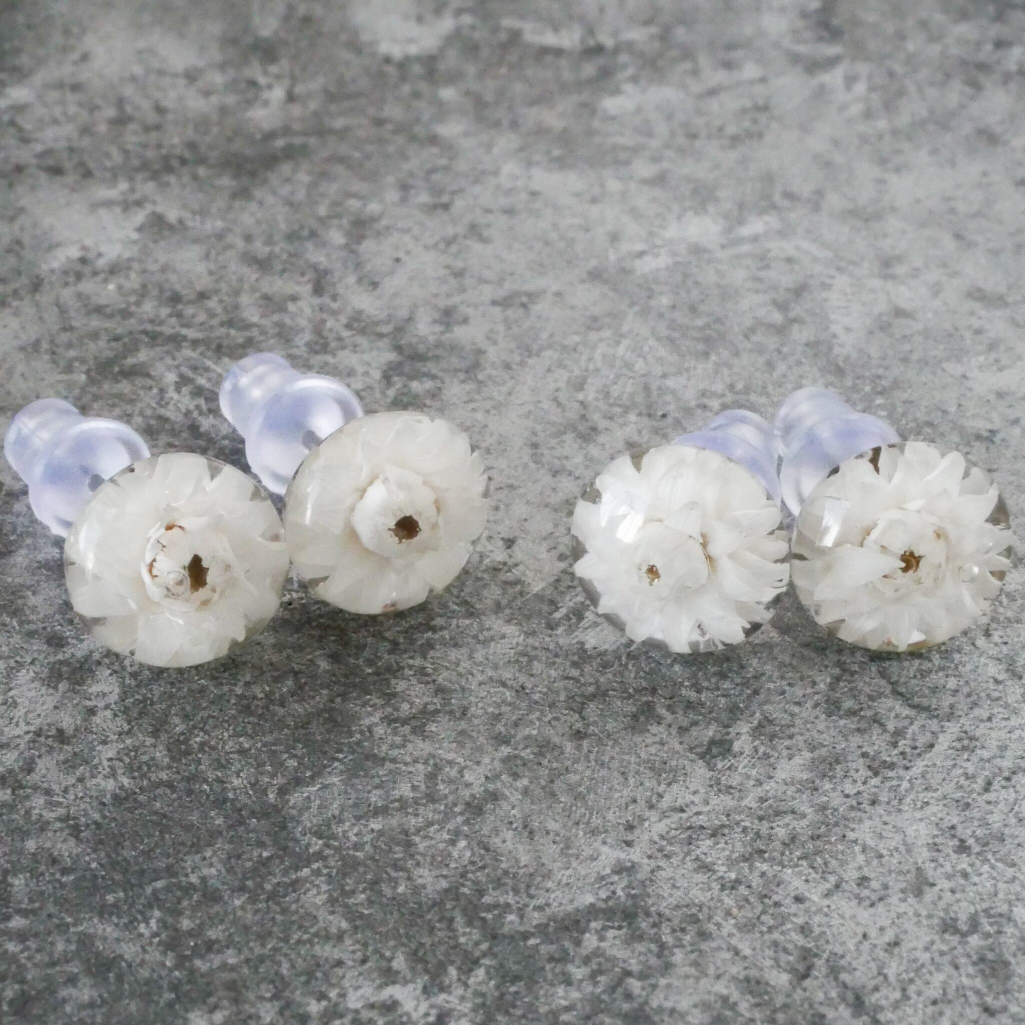 白い小さなお花、ヤマハハコのドライフラワーを樹脂で閉じ込めたプチピアス。