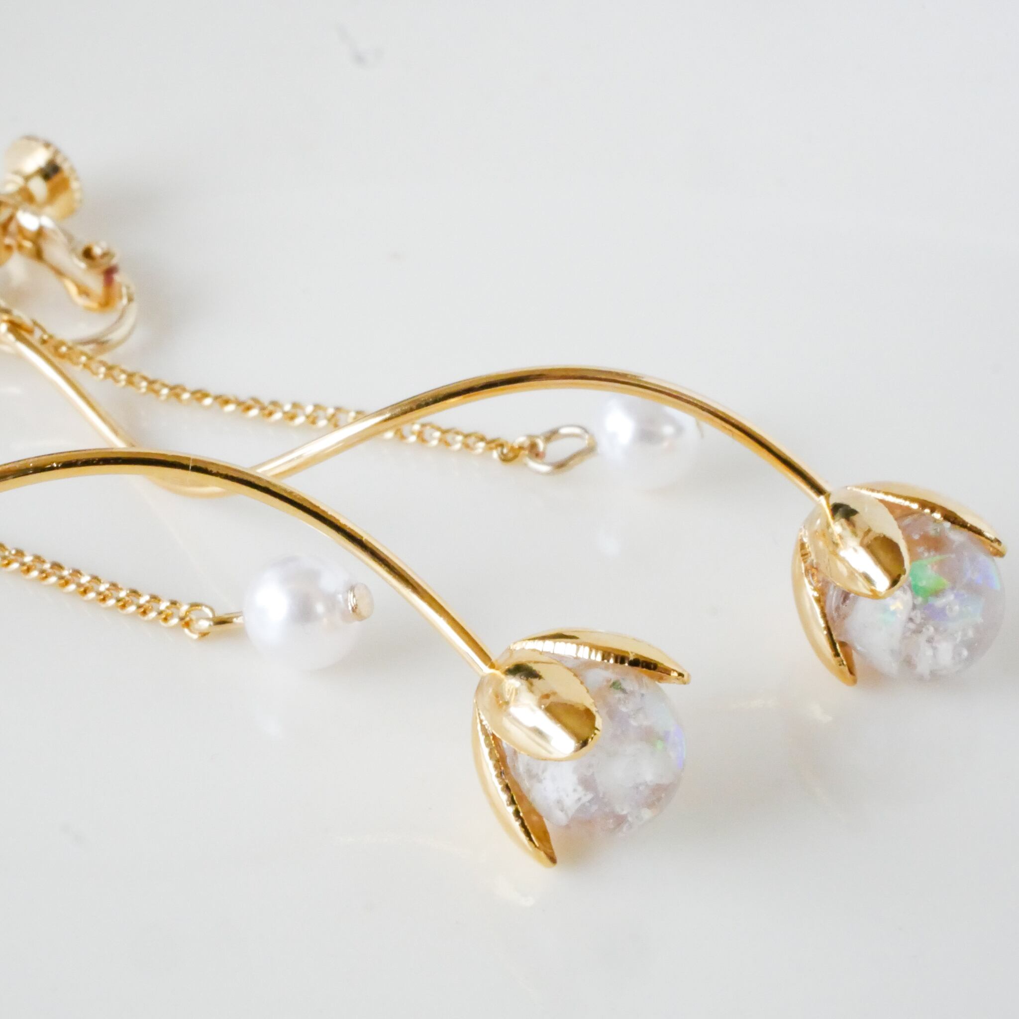 長い湾曲しているパーツの先端には、自家製のドライフラワーを閉じ込めたビーズを組み合わせ、お花の蕾をイメージしました。