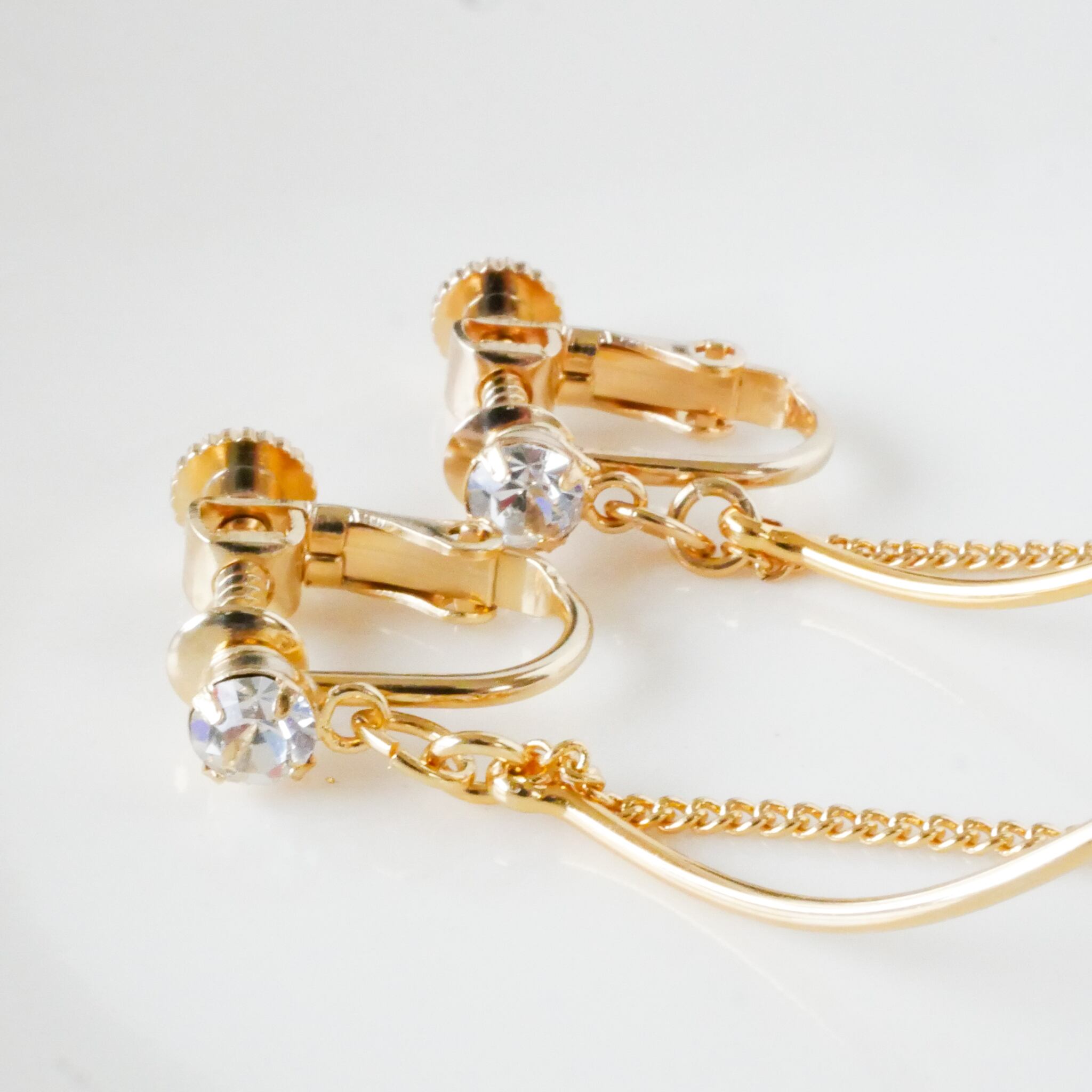 また、イヤリングの正面、先端にはクリアカラーのジルコニアをつけて、全体的に華やかな印象に。揺れたときの動きが異なるので、動くたびに華やかなイヤリングはパーティーや結婚式などフォーマルシーンにもおすすめです。