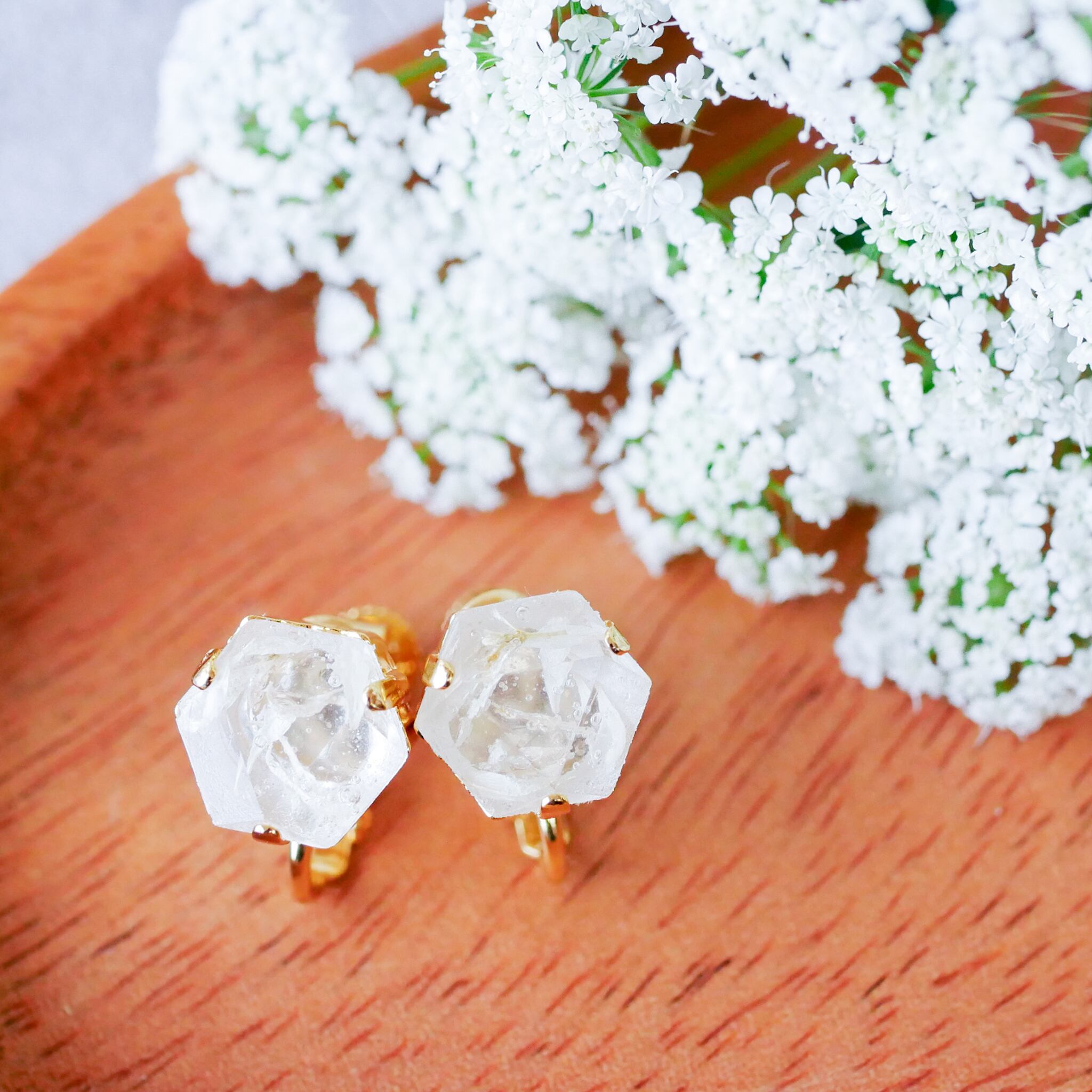 六角形のビジュー型に、本物のお花を閉じ込めたドライフラワーのイヤリング。