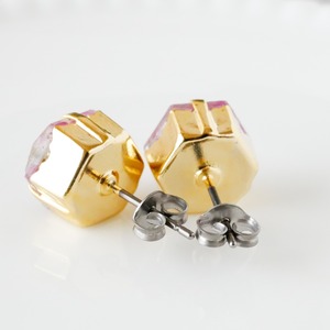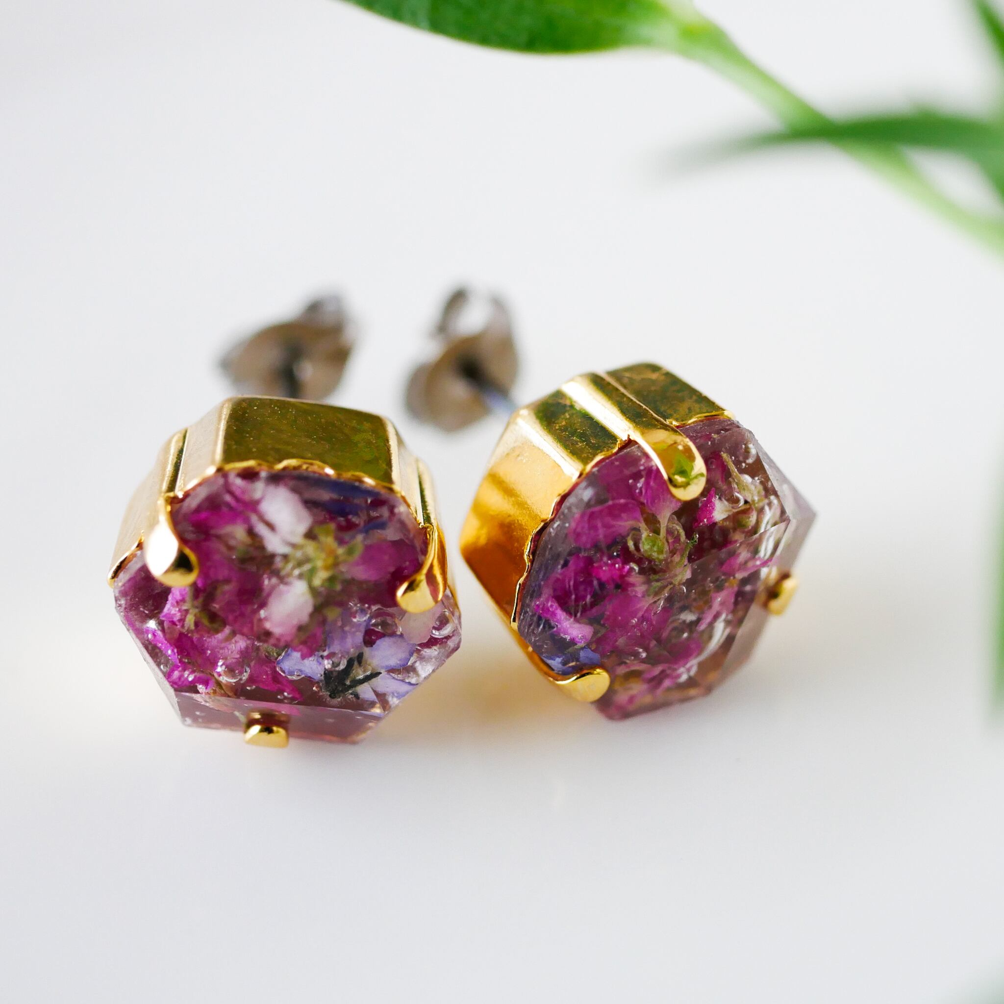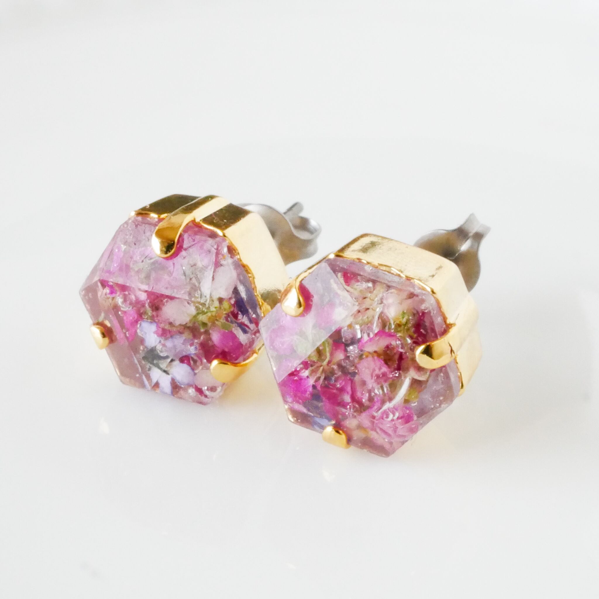 六角形のビジュー型に、本物のお花を閉じ込めたドライフラワーのピアス。